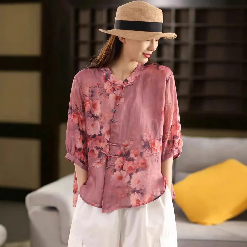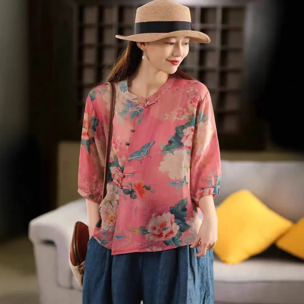 衣都精品- 新款復古數碼印花立領斜襟盤扣上衣
