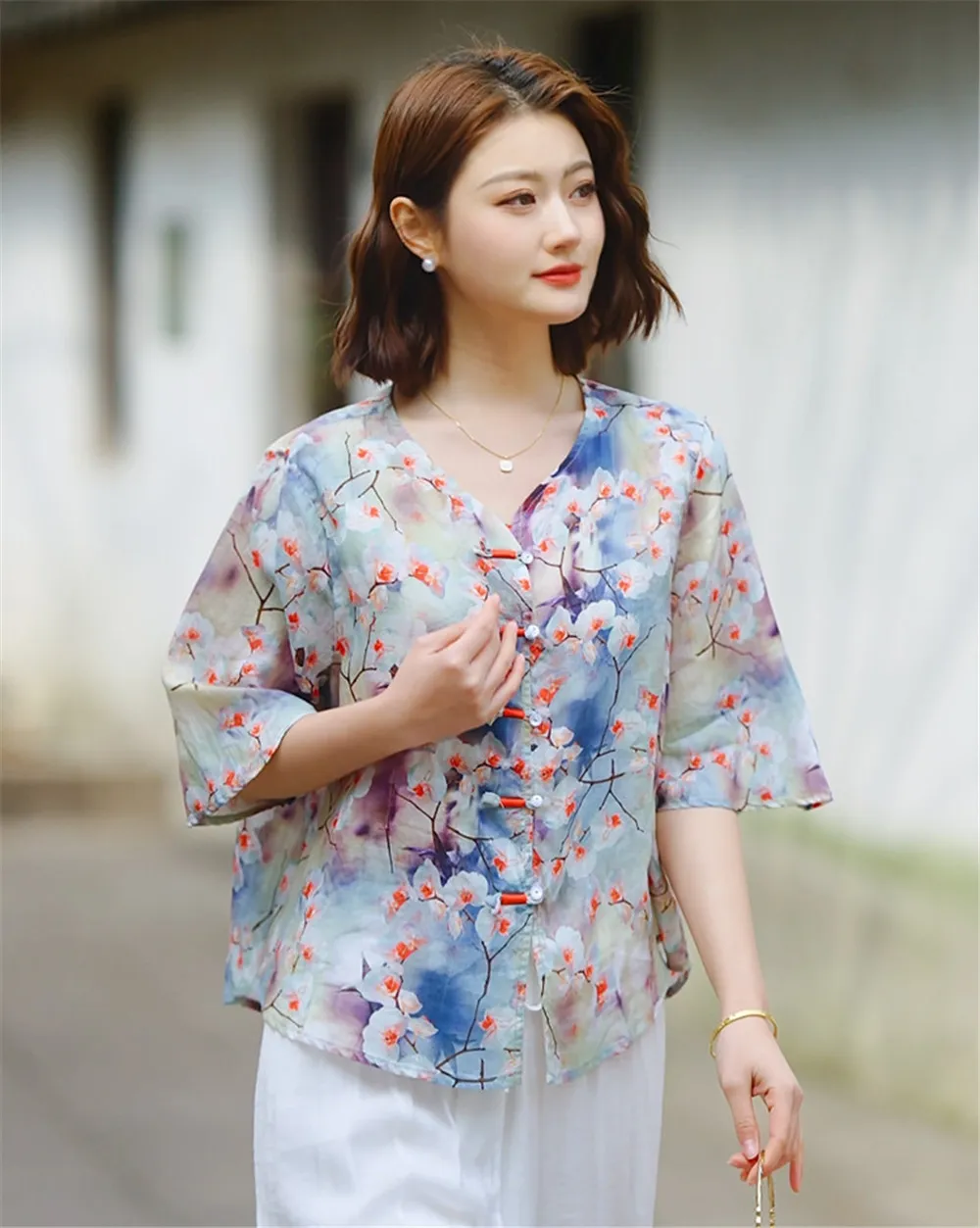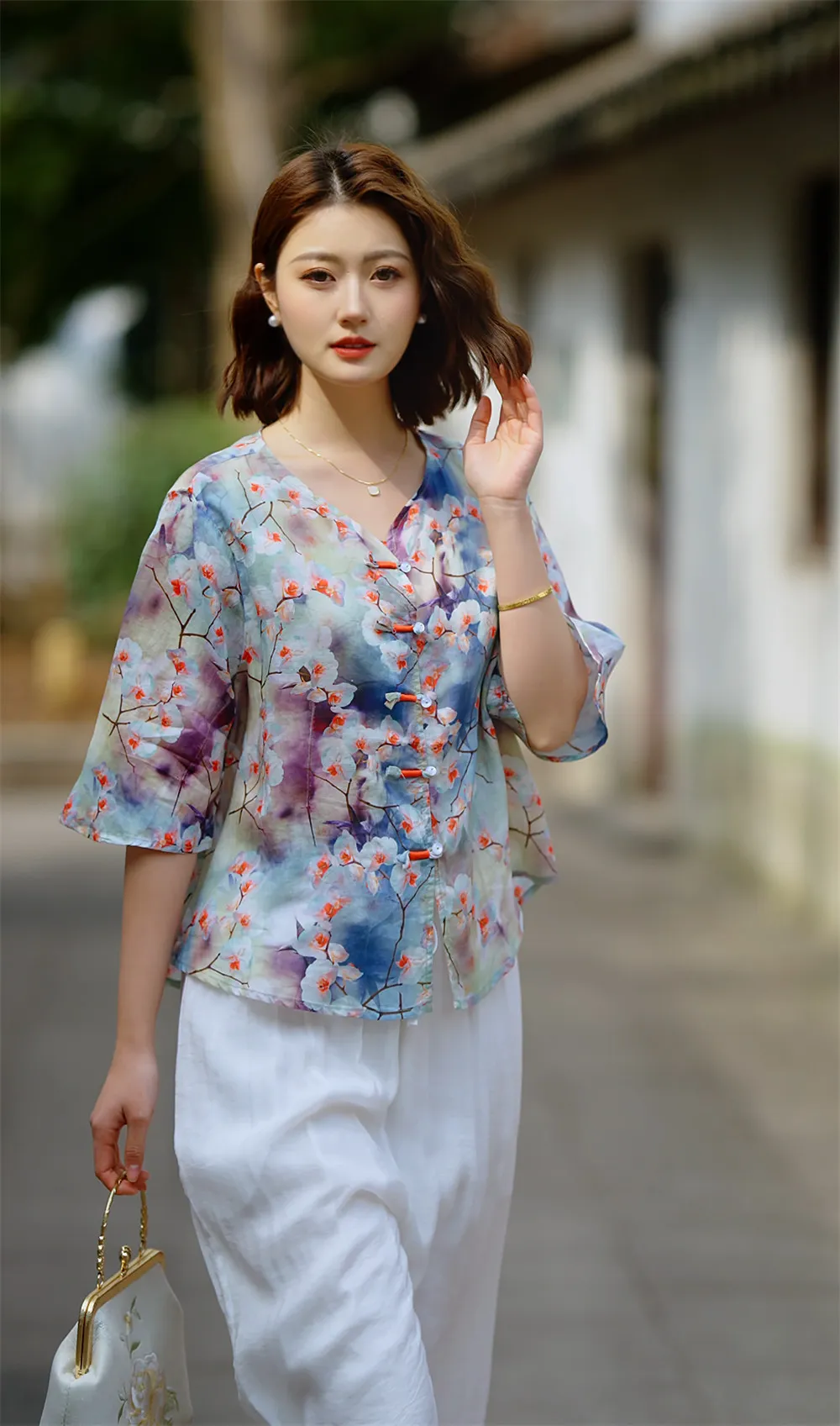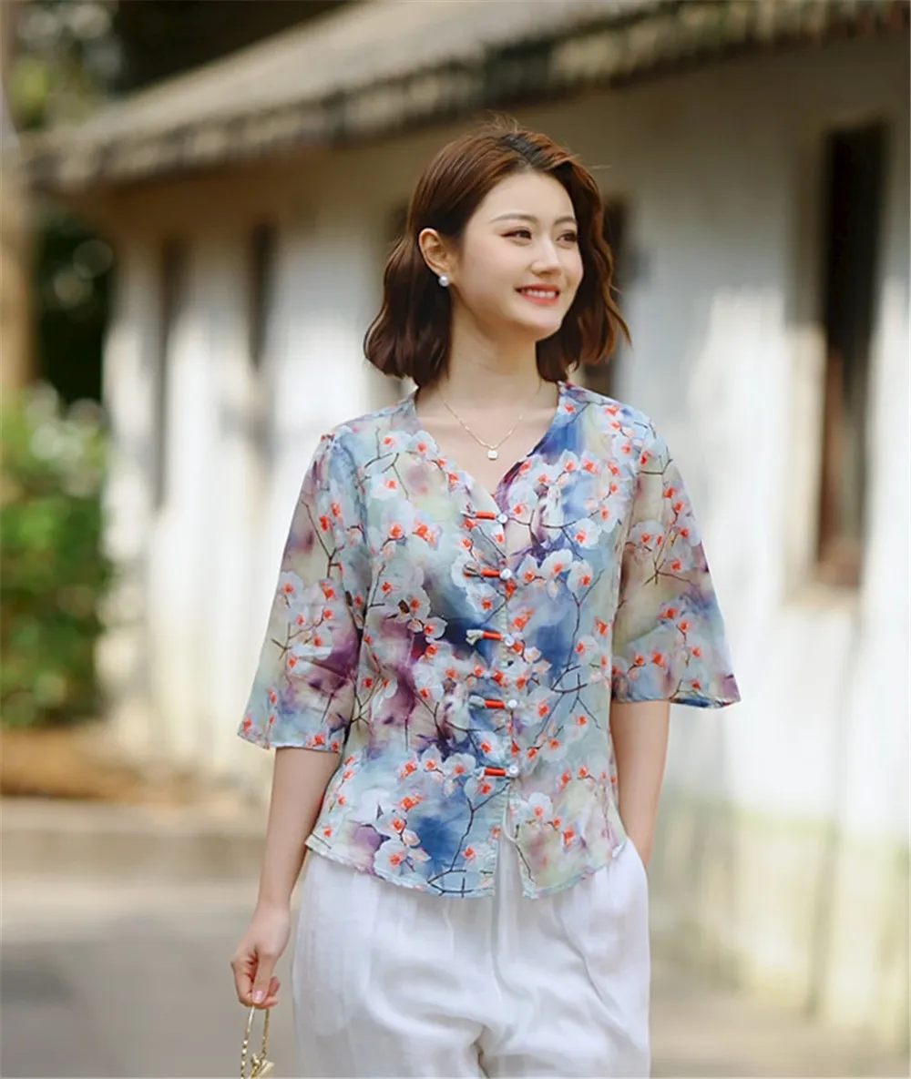 衣都精品- 新款復古數碼印花立領斜襟盤扣上衣