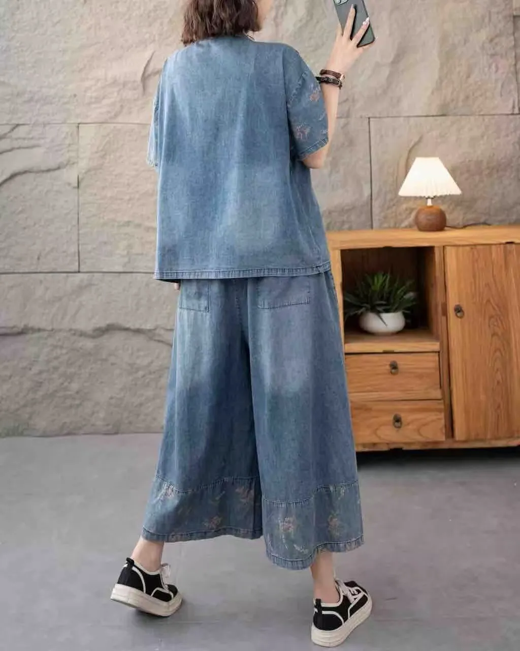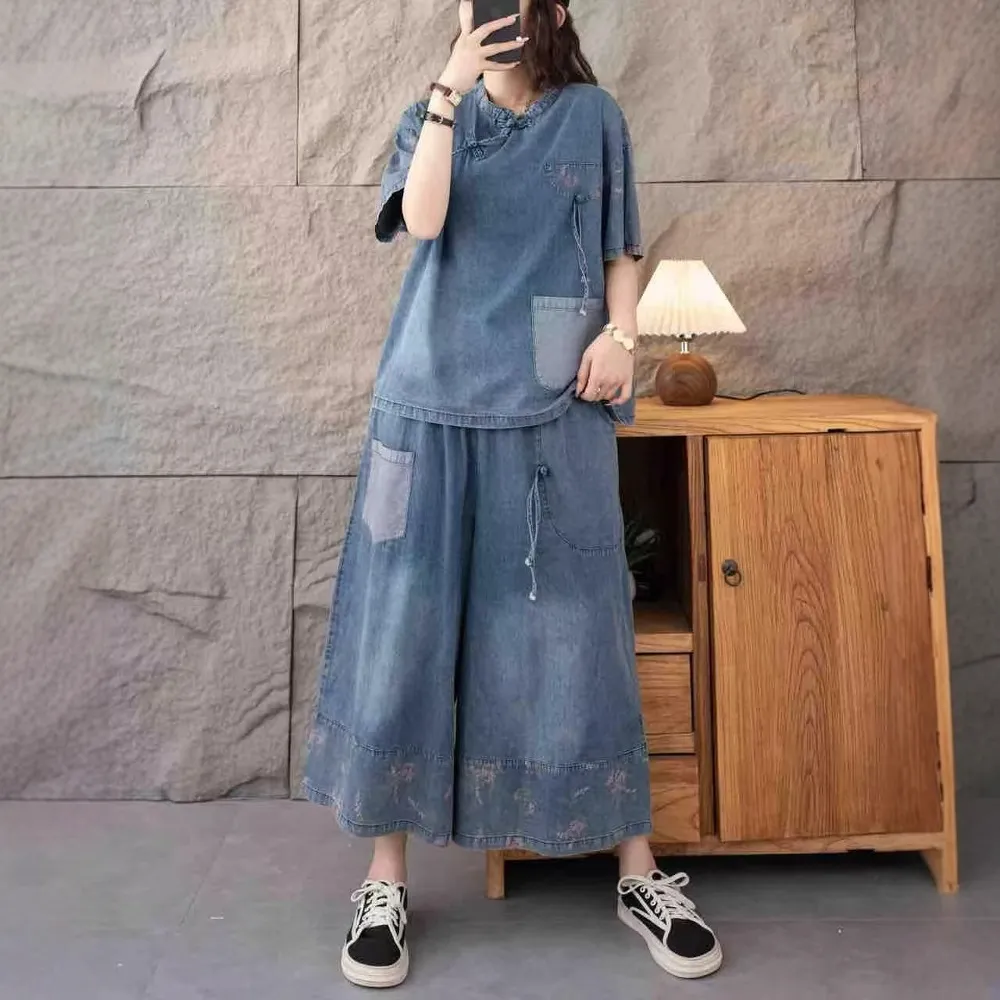 衣都精品- 新款套頭立領貼布復古牛仔上衣+貼布印花九分牛仔褲套裝