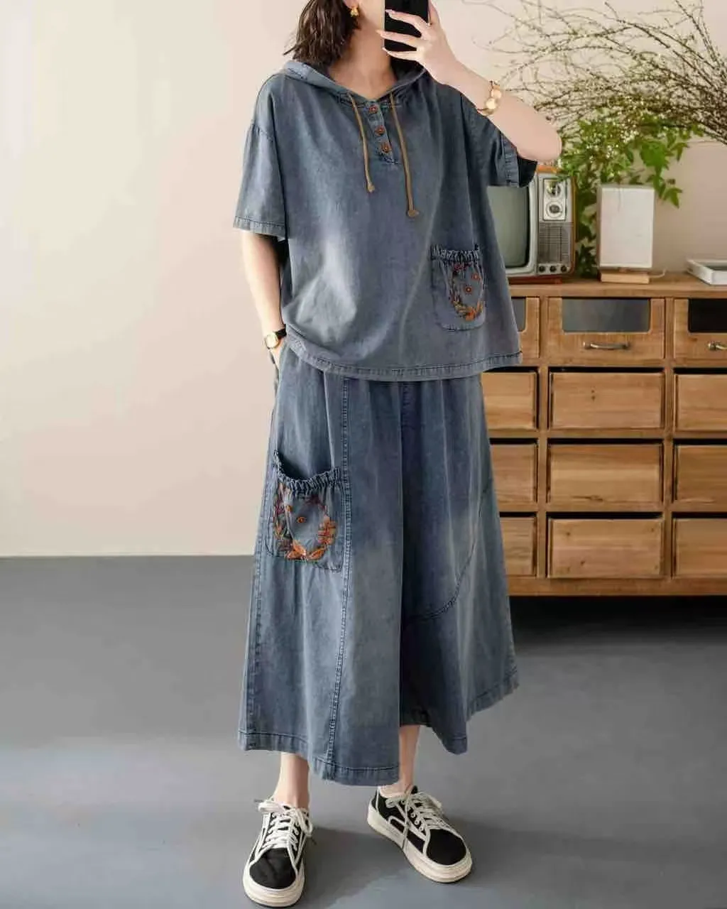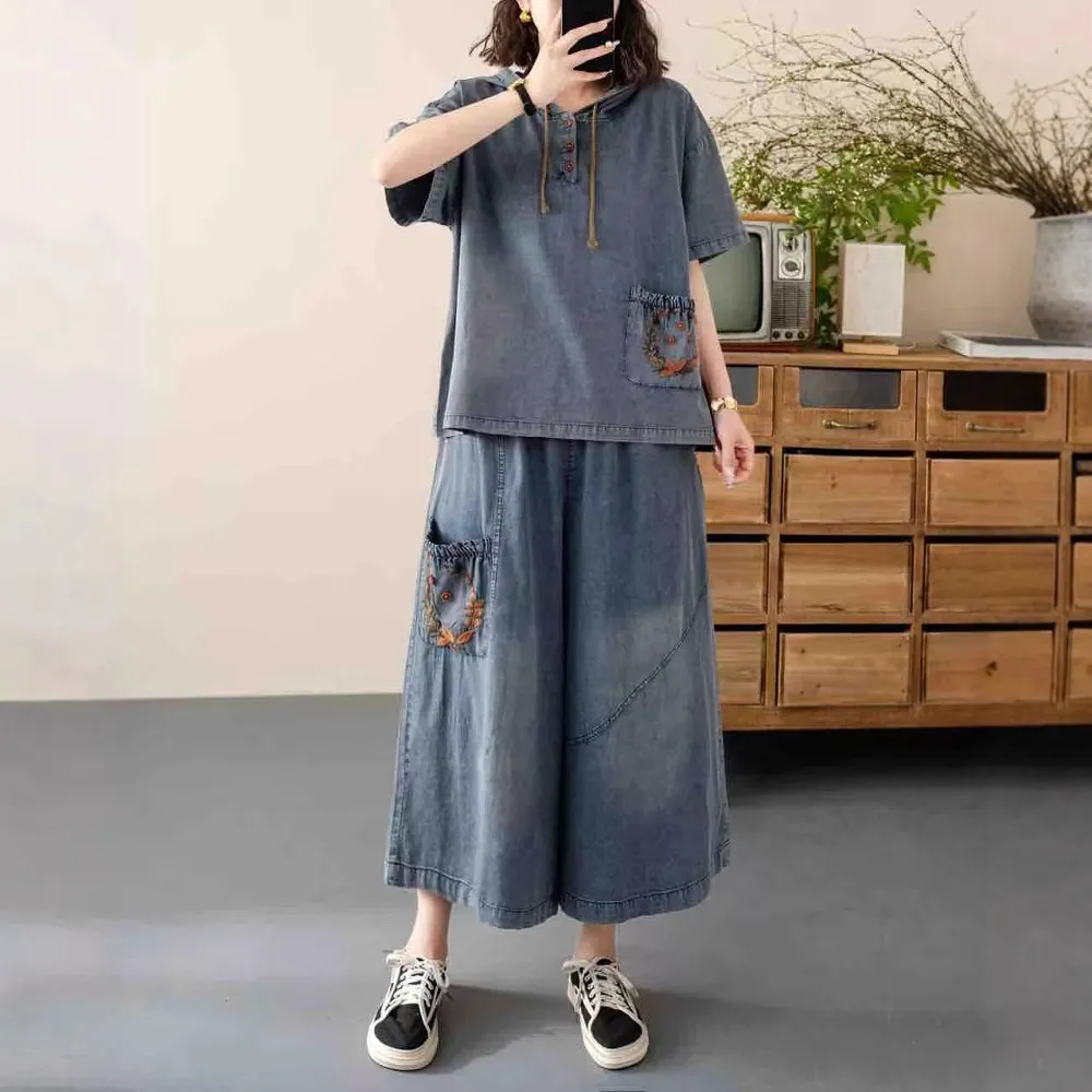 衣都精品- 新款套頭立領貼布復古牛仔上衣+貼布印花九分牛仔褲套裝