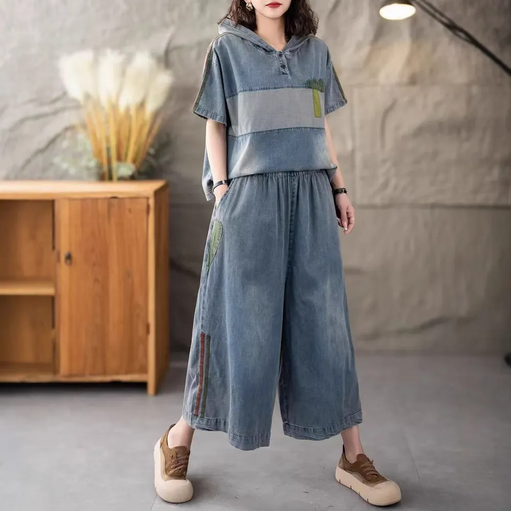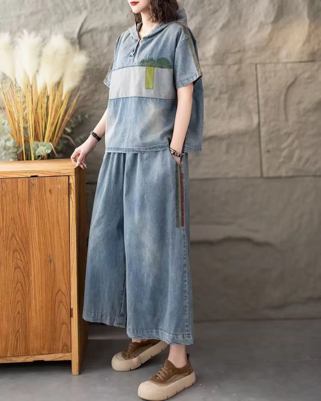 衣都精品- 新款撞色拼接連帽短袖套頭上衣+九分闊腿牛仔褲套裝