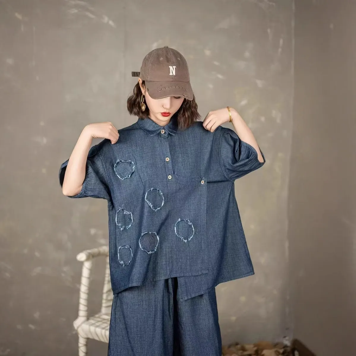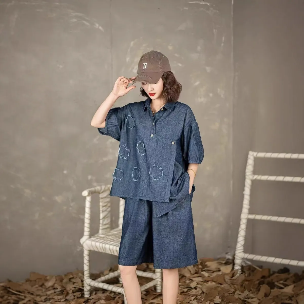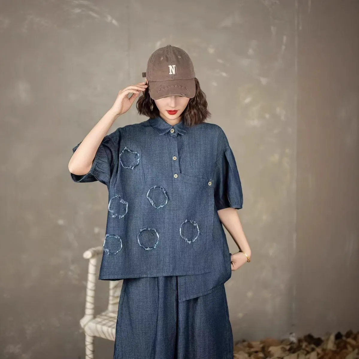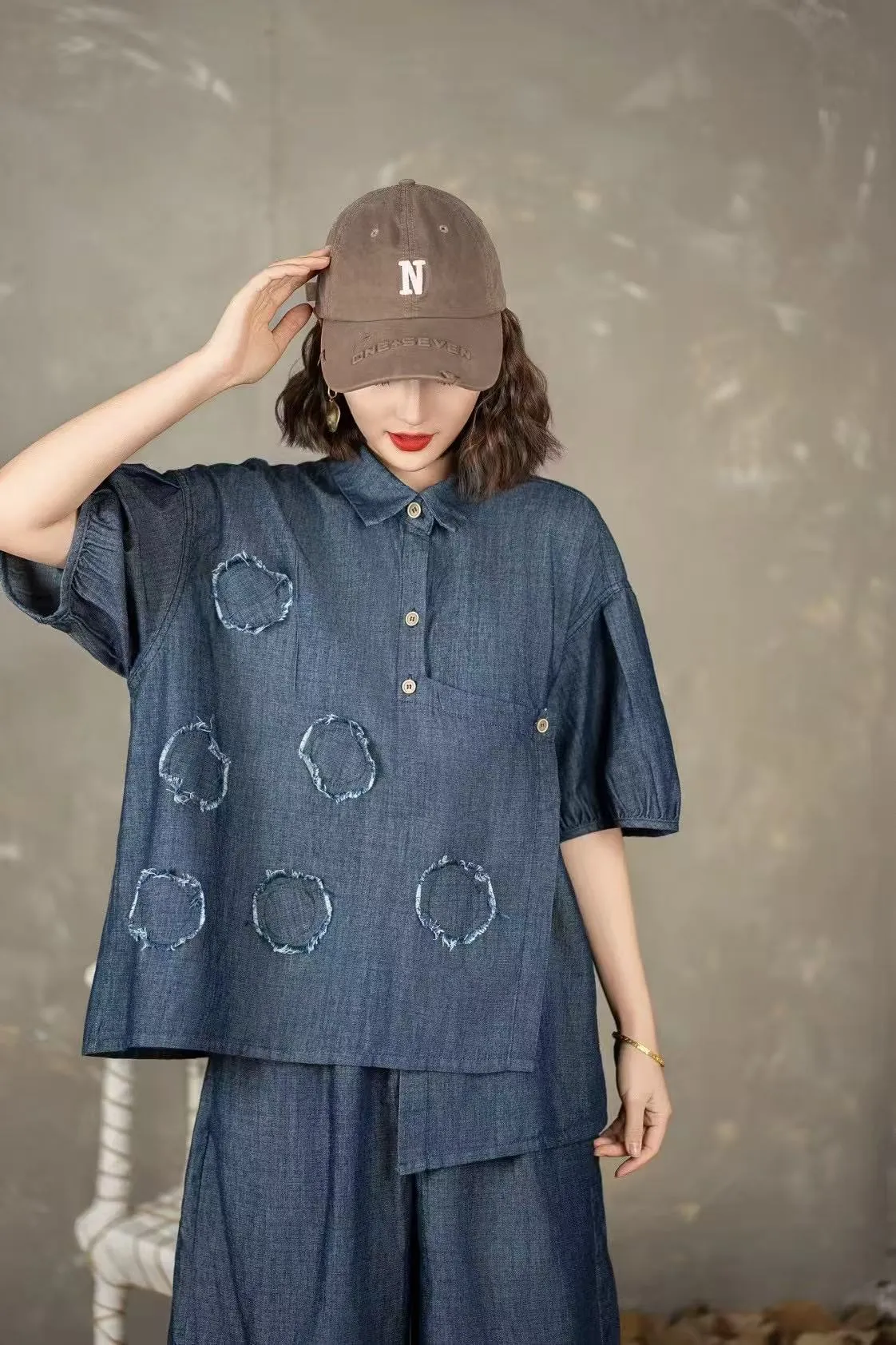 衣都精品- 新款套頭立領貼布復古牛仔上衣+貼布印花九分牛仔褲套裝