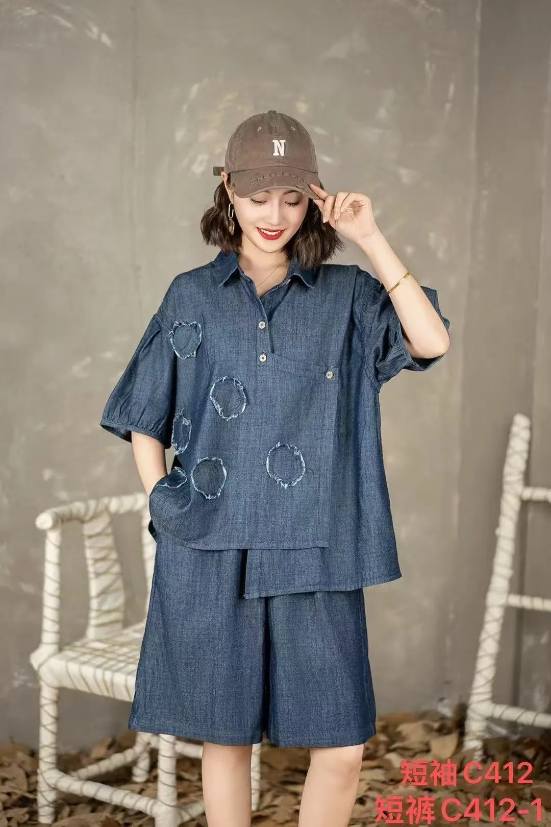 衣都精品- 新款套頭立領貼布復古牛仔上衣+貼布印花九分牛仔褲套裝