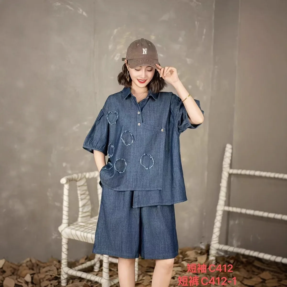 衣都精品- 新款立領短袖水洗印花牛仔上衣+鬆緊腰印花哈倫牛仔褲套裝