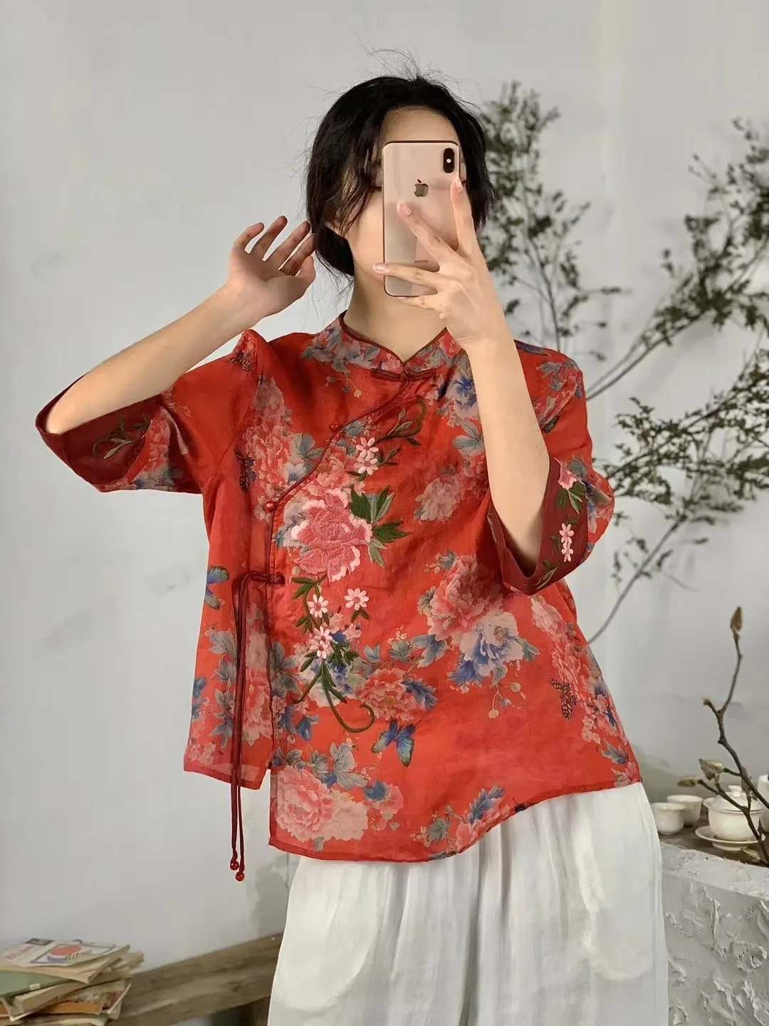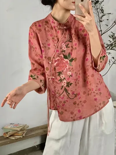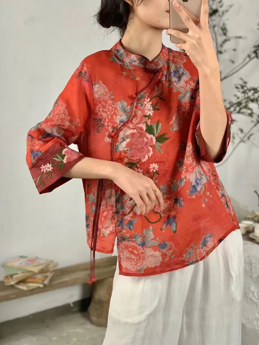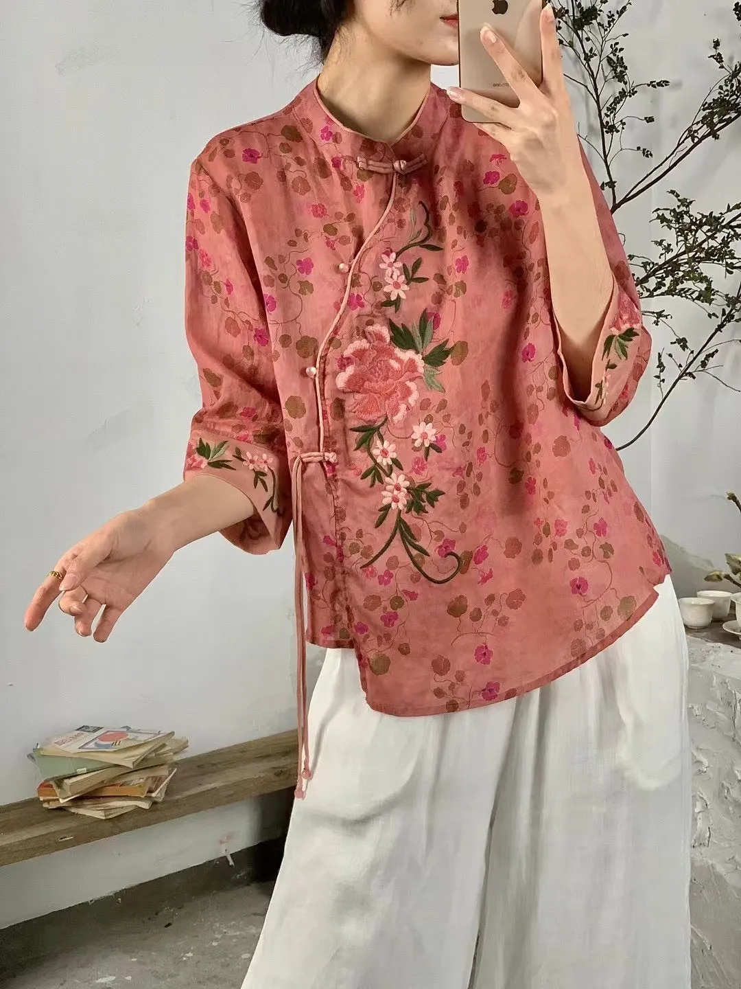 衣都精品- 新款刺繡拼接撞色斜襟流蘇氣質上衣