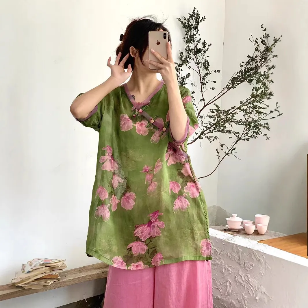 衣都精品- 新款文藝V領印花套頭拼接寬鬆上衣