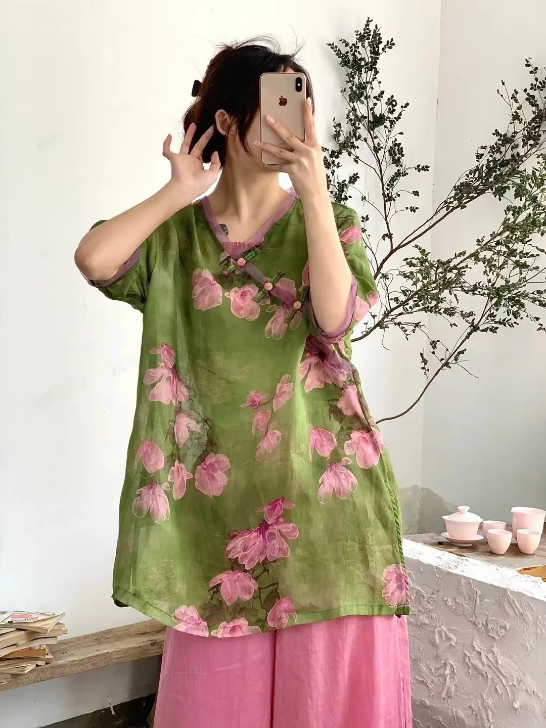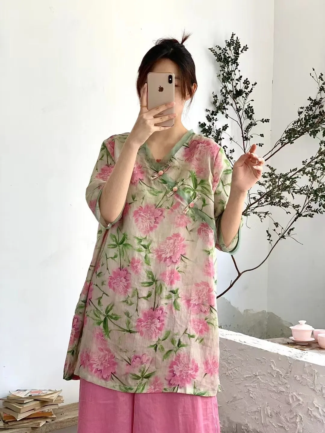 衣都精品- 新款圓領數碼印花V領五分袖長上衣