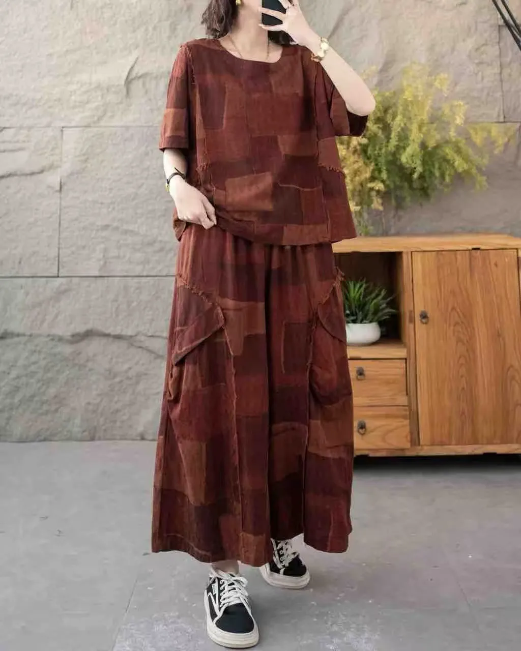 衣都精品- 新款復古百搭寬鬆顯瘦調色系印花雙層半身裙