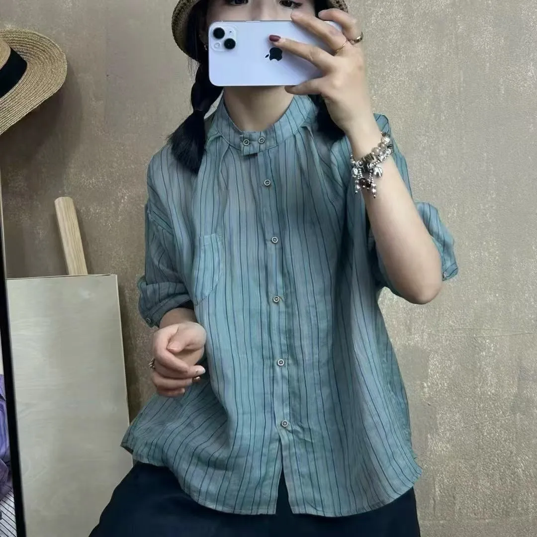 衣都精品- 新款立領單排扣百搭條紋上衣