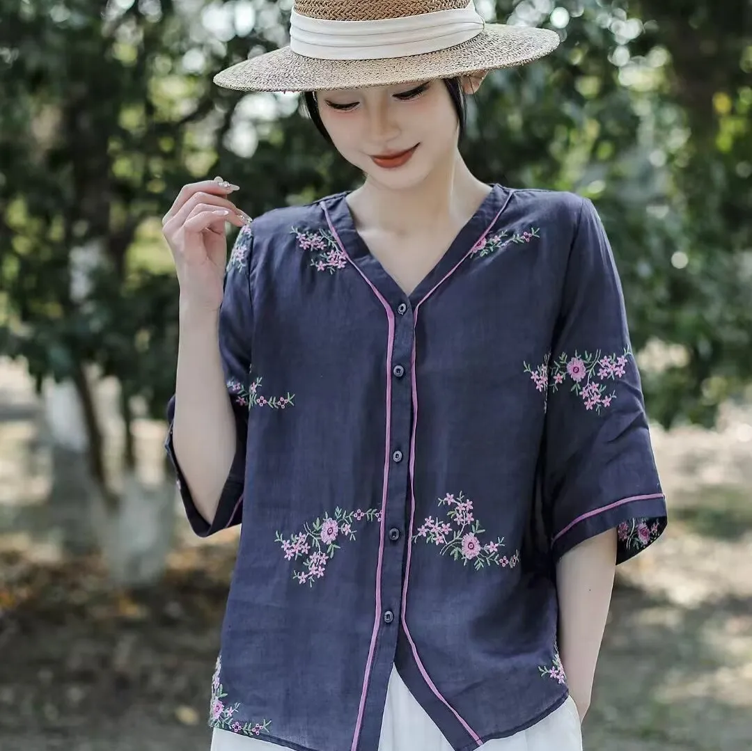 衣都精品- 新款圓領套頭拼接復古盤扣鏤空上衣