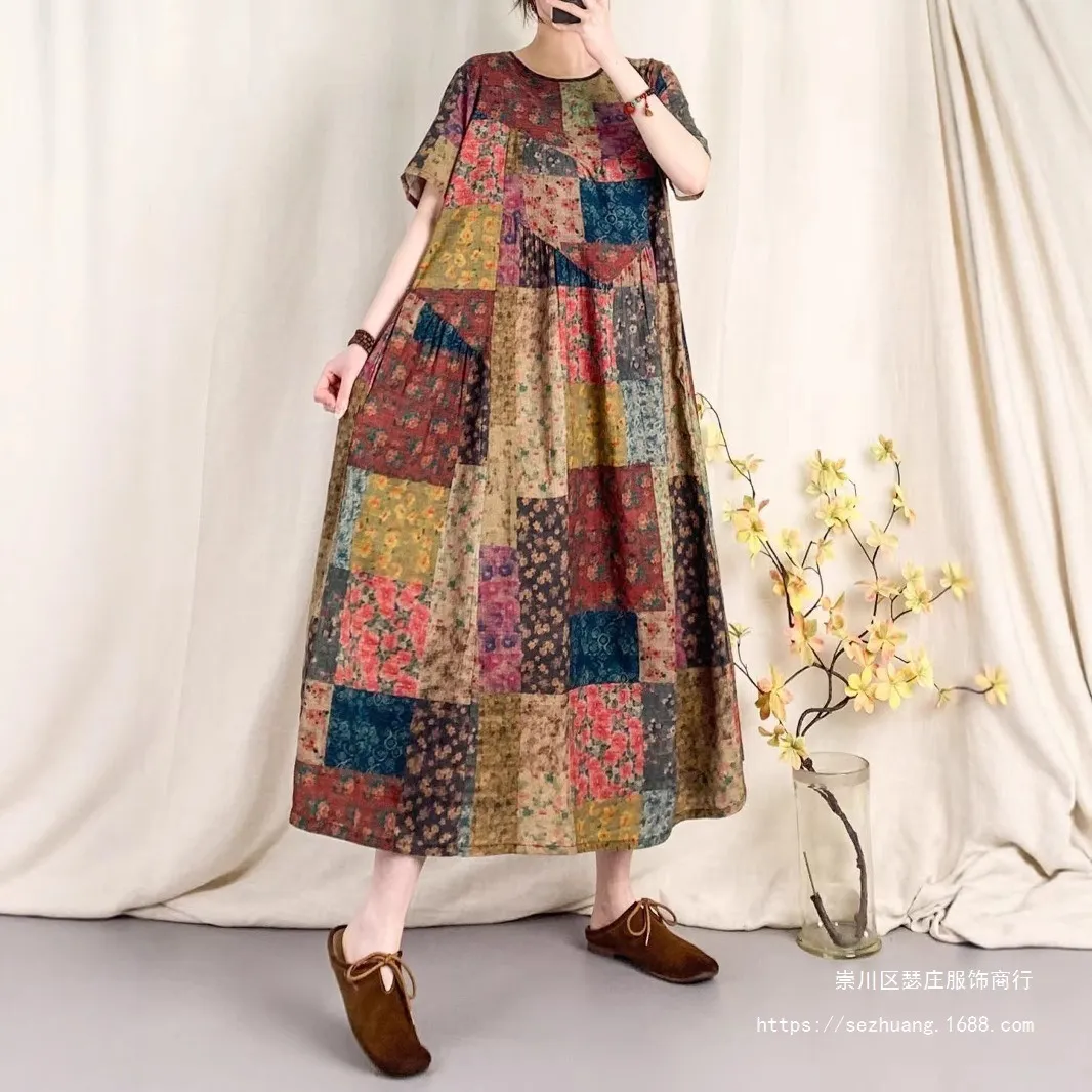 衣都精品- 新款復古寬鬆圓領套頭大碼印花連衣裙