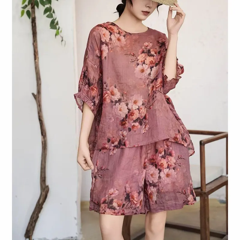 衣都精品- 新款復古印花圓領套頭七分袖上衣