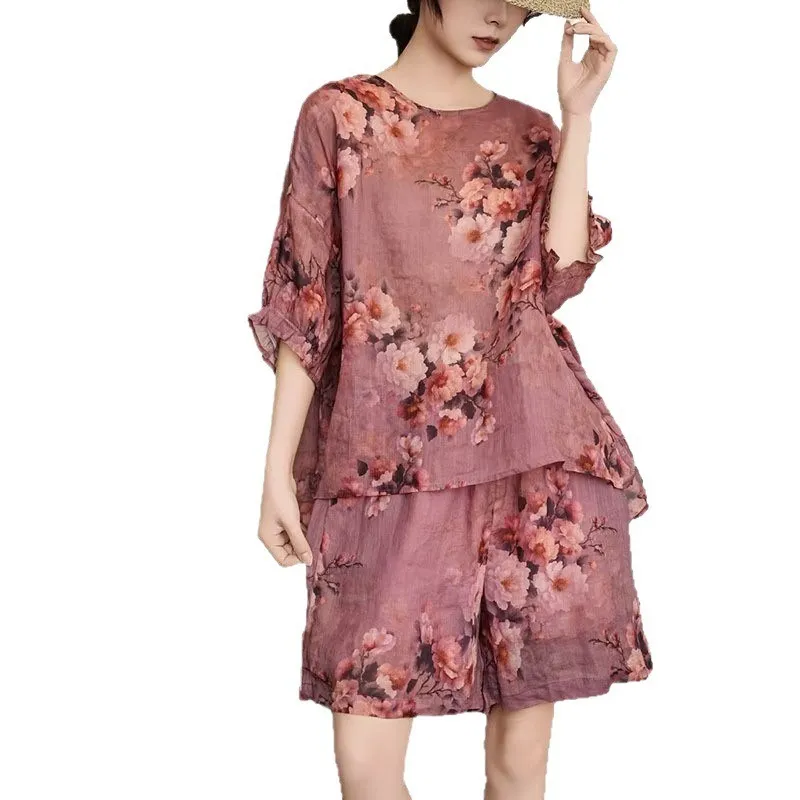 衣都精品- 新款復古印花圓領套頭七分袖上衣
