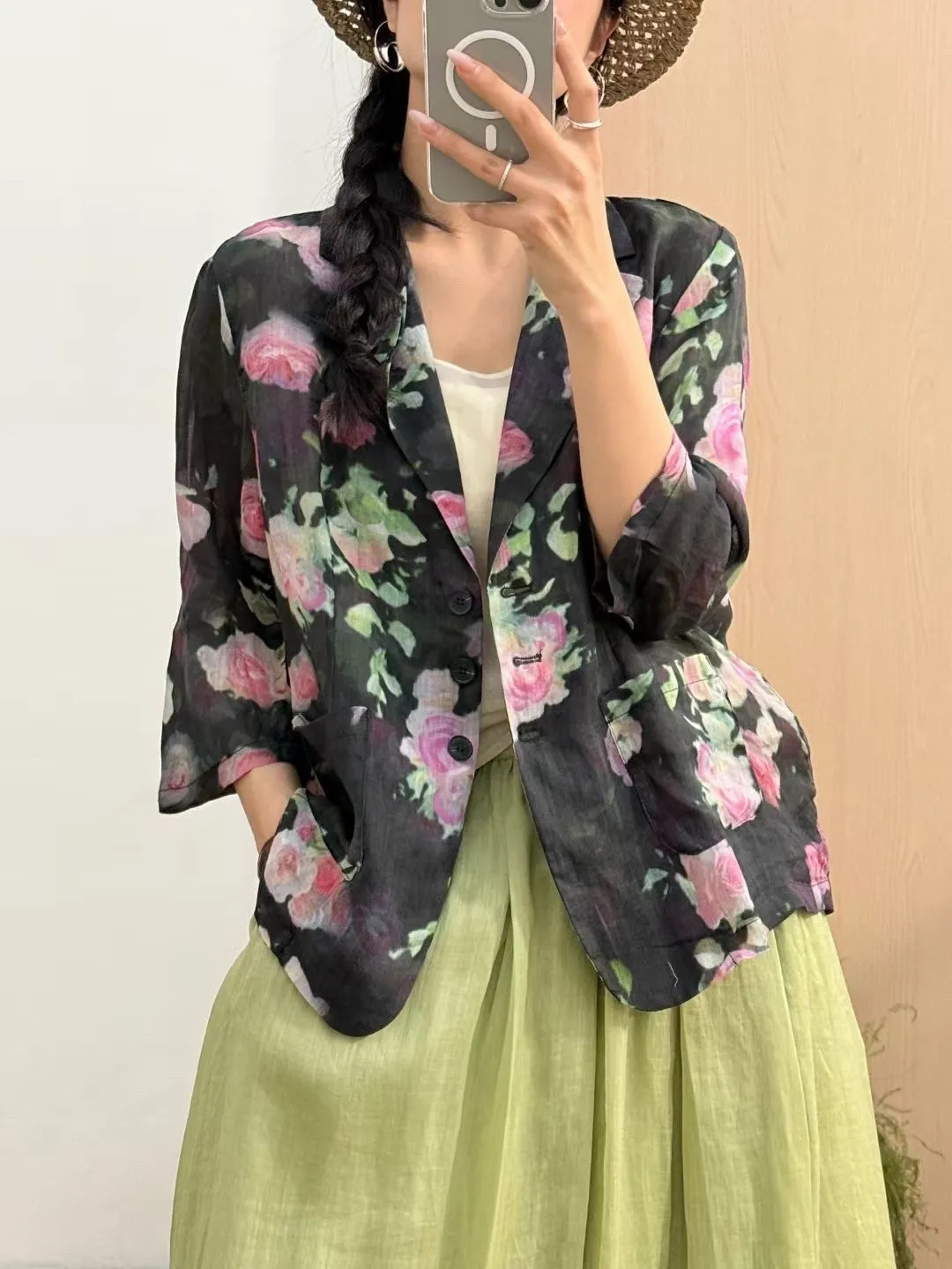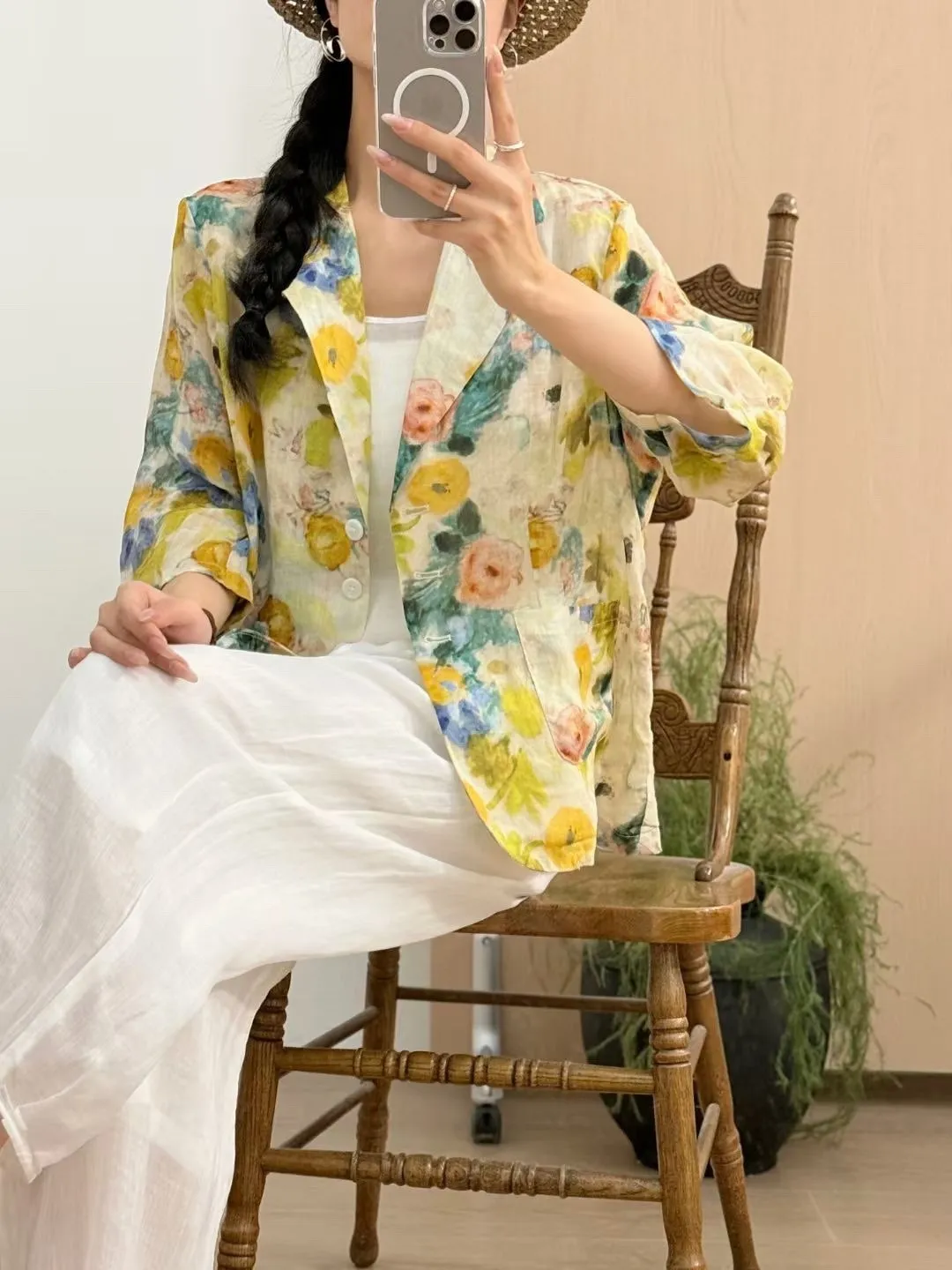 衣都精品- 新款田園風印花翻領三粒扣西裝外套