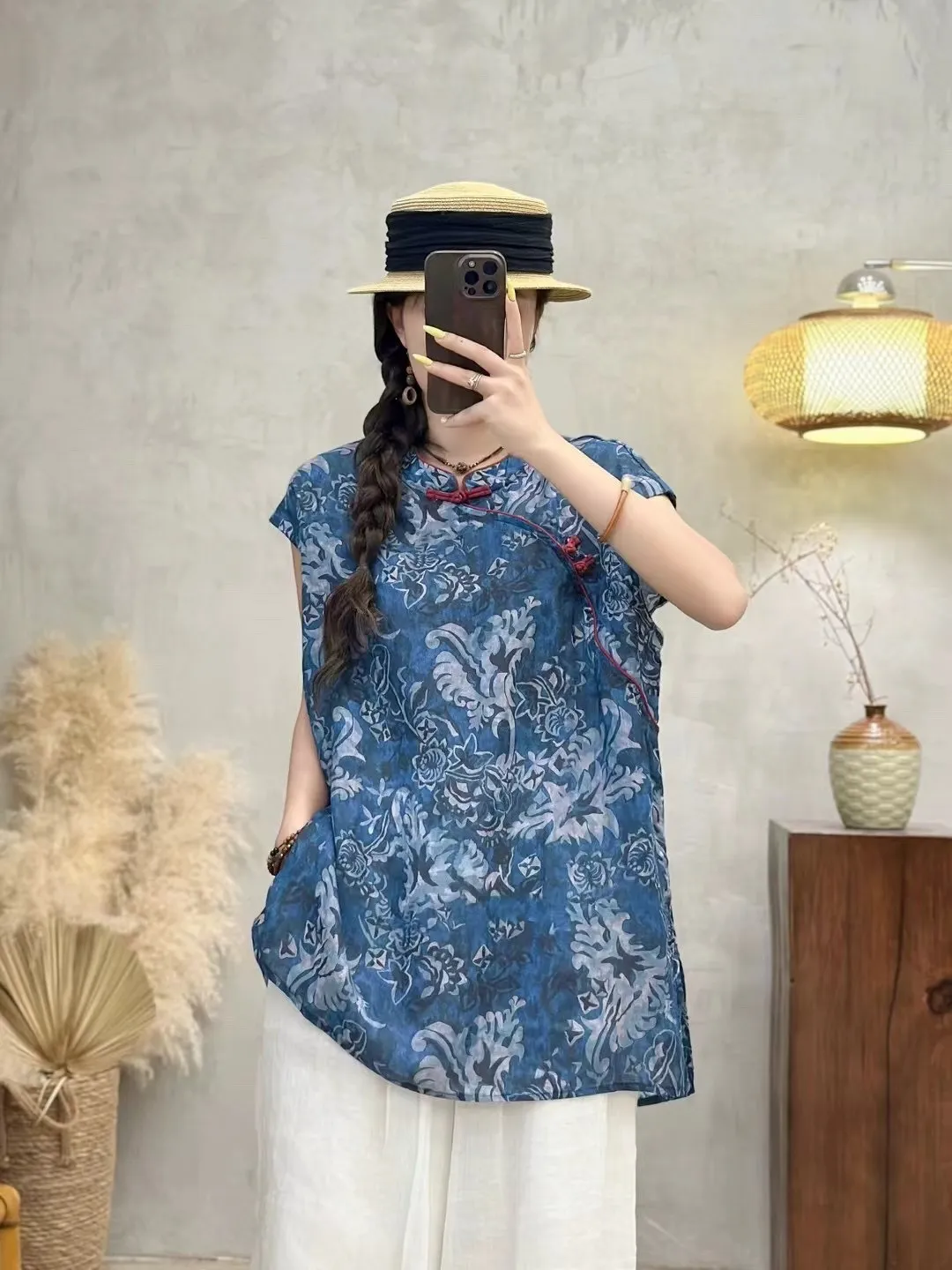 衣都精品- 新款復古做舊印花無袖寬鬆馬甲上衣