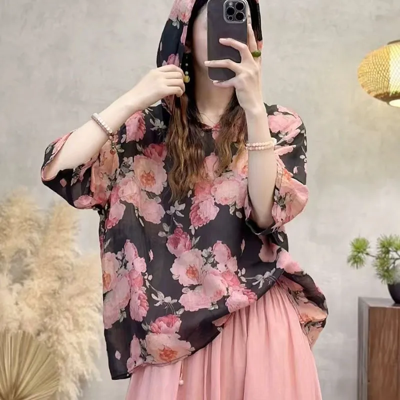 衣都精品- 新款數位印花連帽套頭拼接五分袖上衣