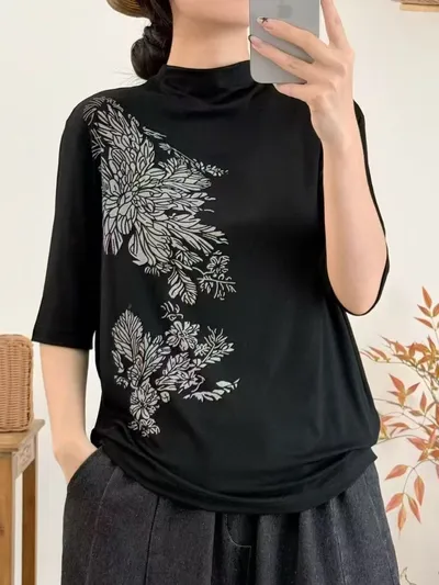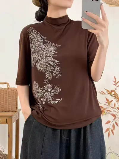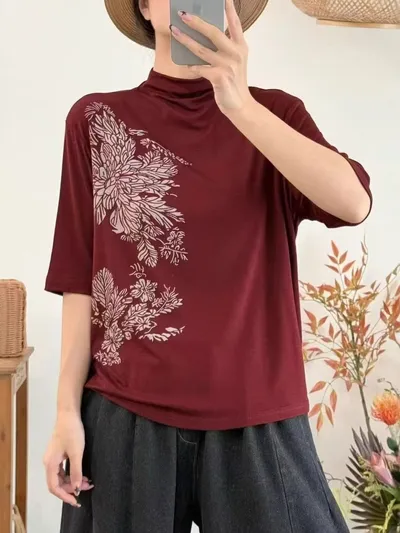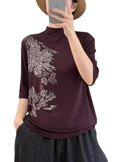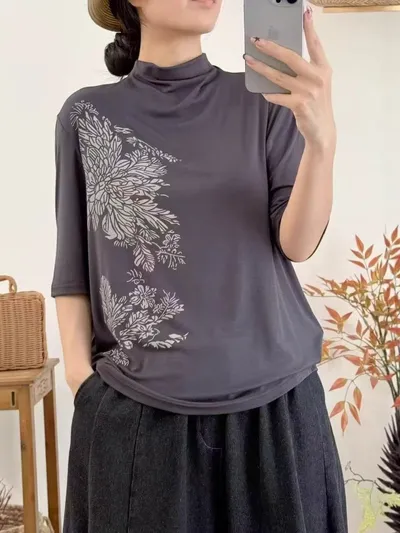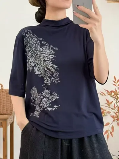 衣都精品- 新款立領套頭五分袖中長款復古上衣