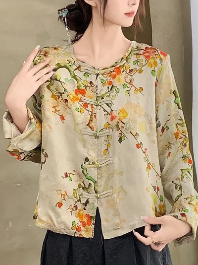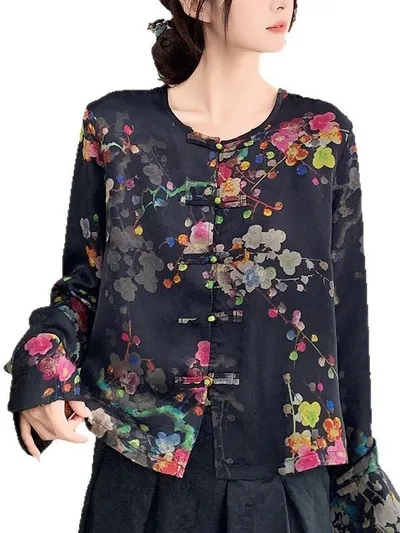 衣都精品- 新款民族風印花緞面提花單排扣盤扣上衣