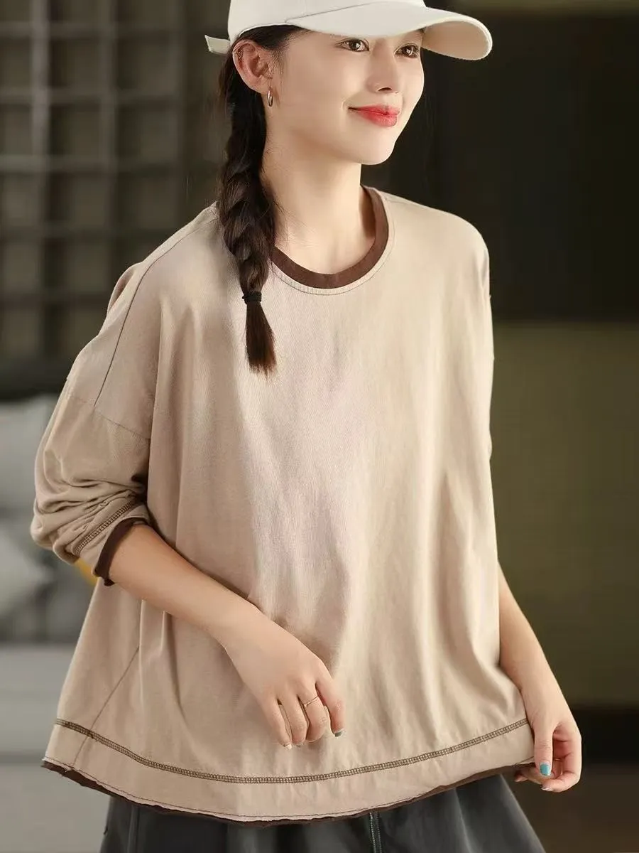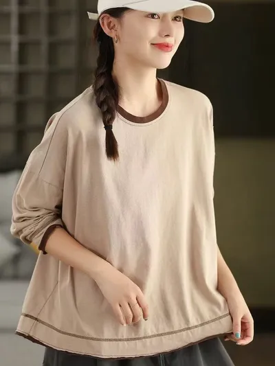 衣都精品- 新款文藝寬鬆顯瘦套頭拼色上衣