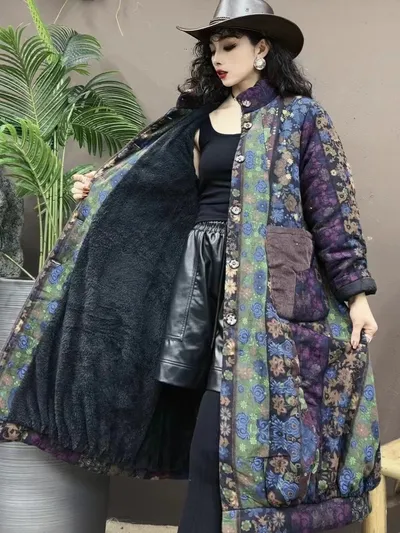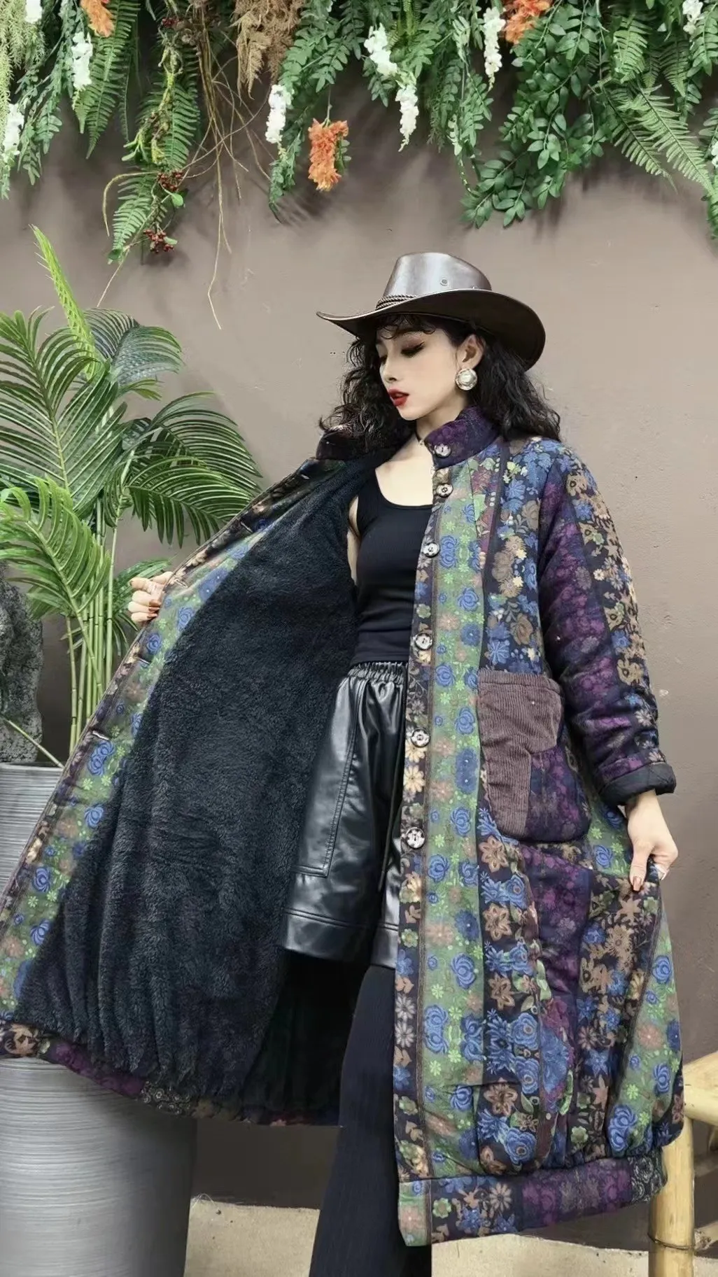 衣都精品- 新款復古長款立領拼接中國風寬鬆夾棉外套