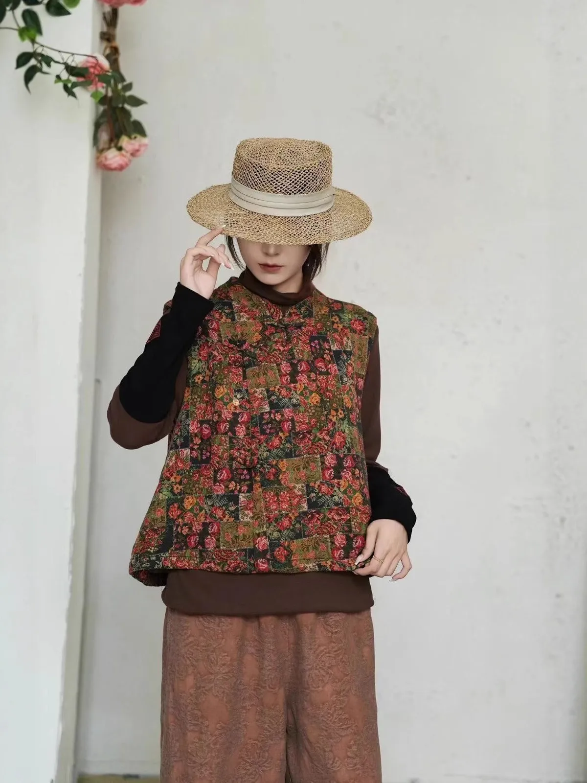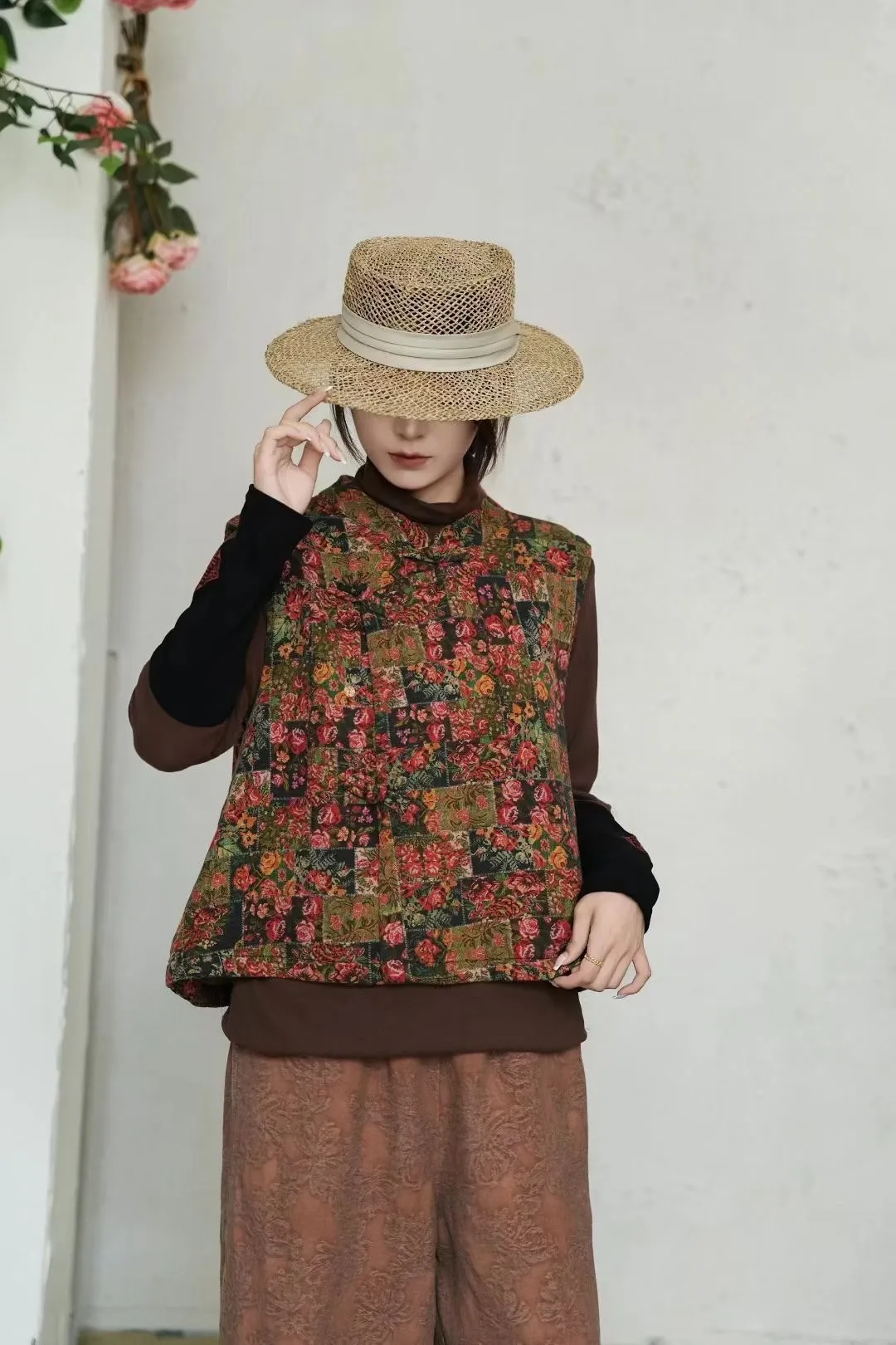 衣都精品- 新款復古寬鬆印花拼接夾棉馬甲外套