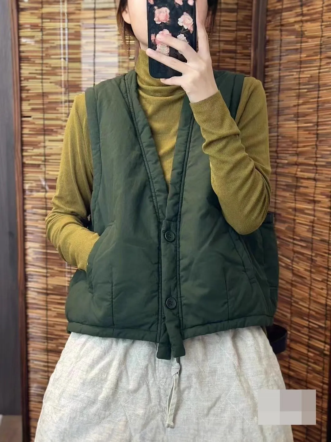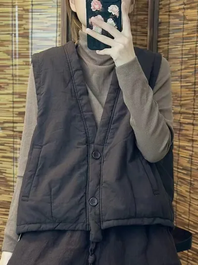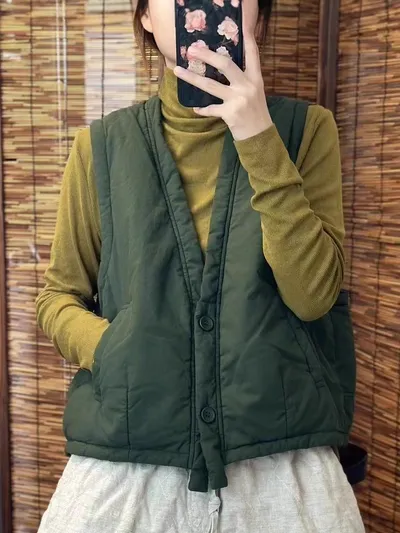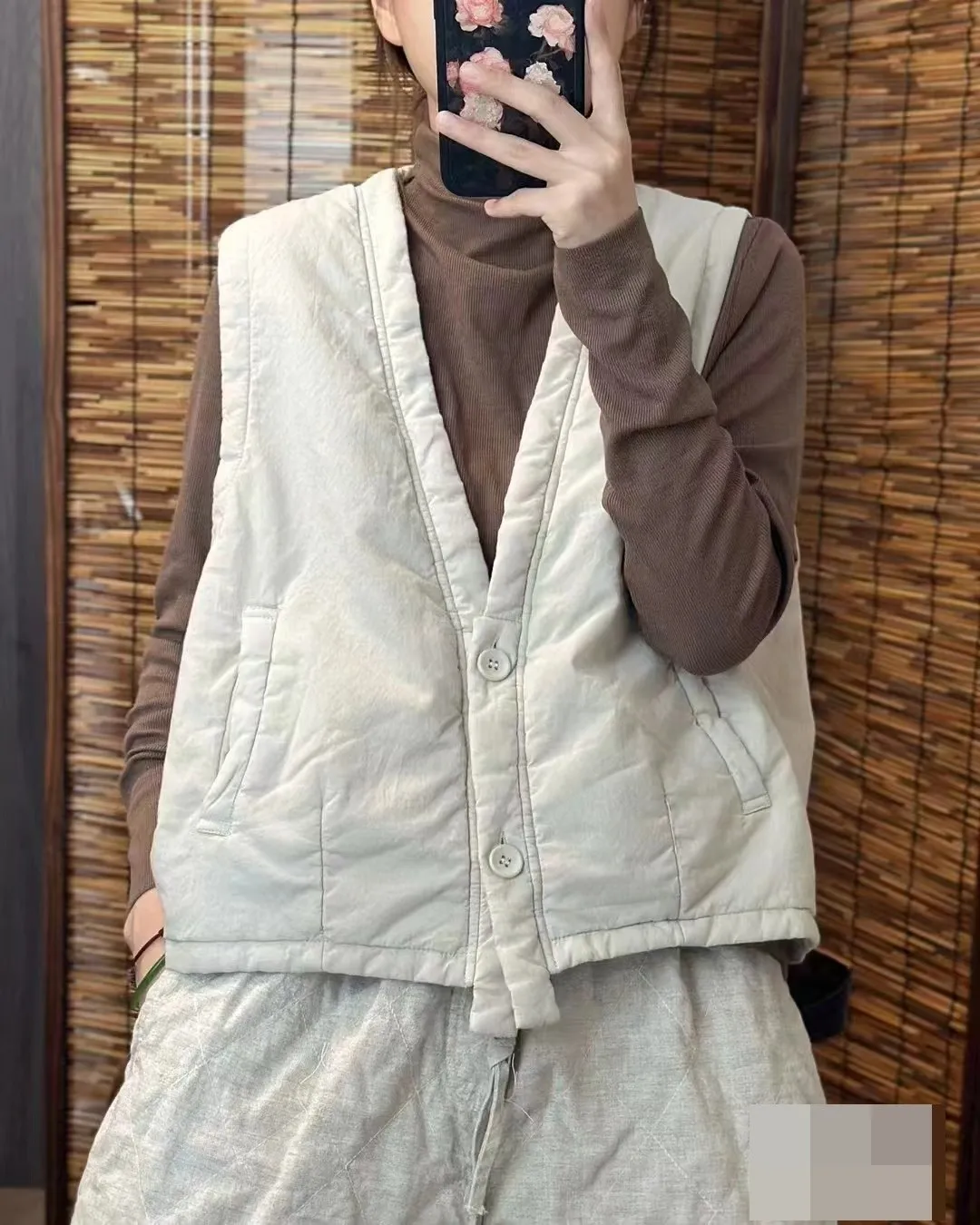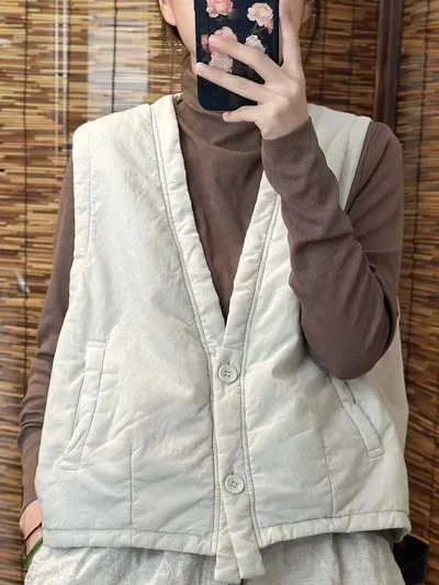 衣都精品- 新款簡約純色V領夾棉馬甲外套