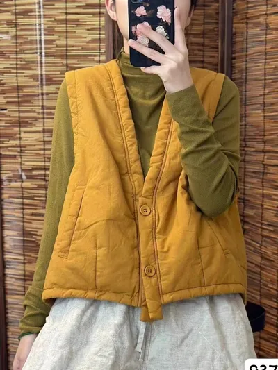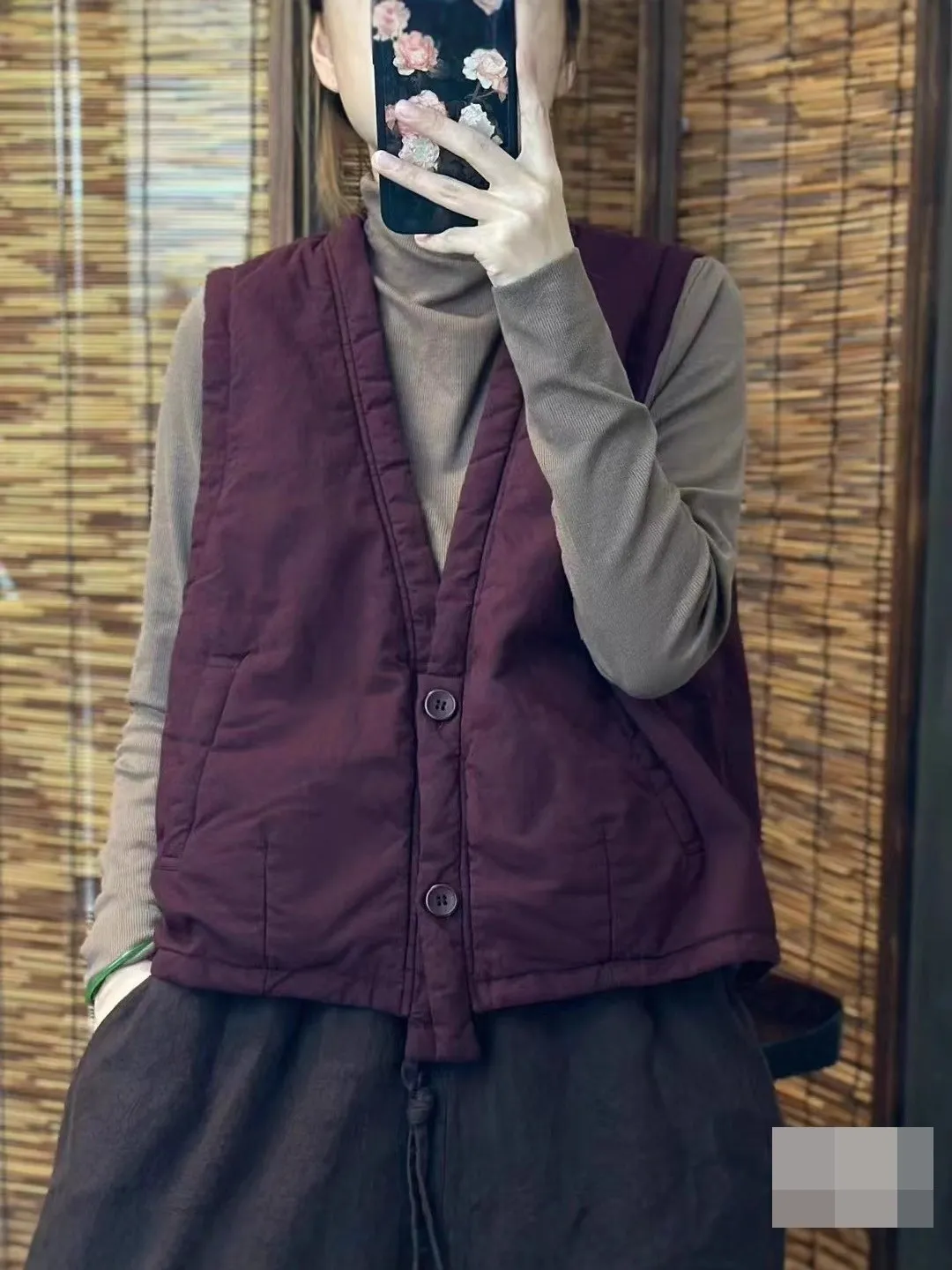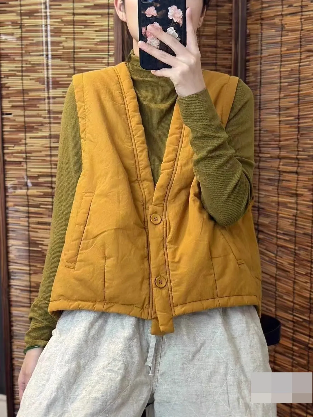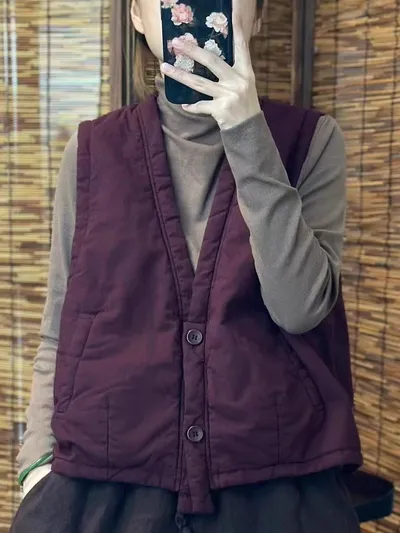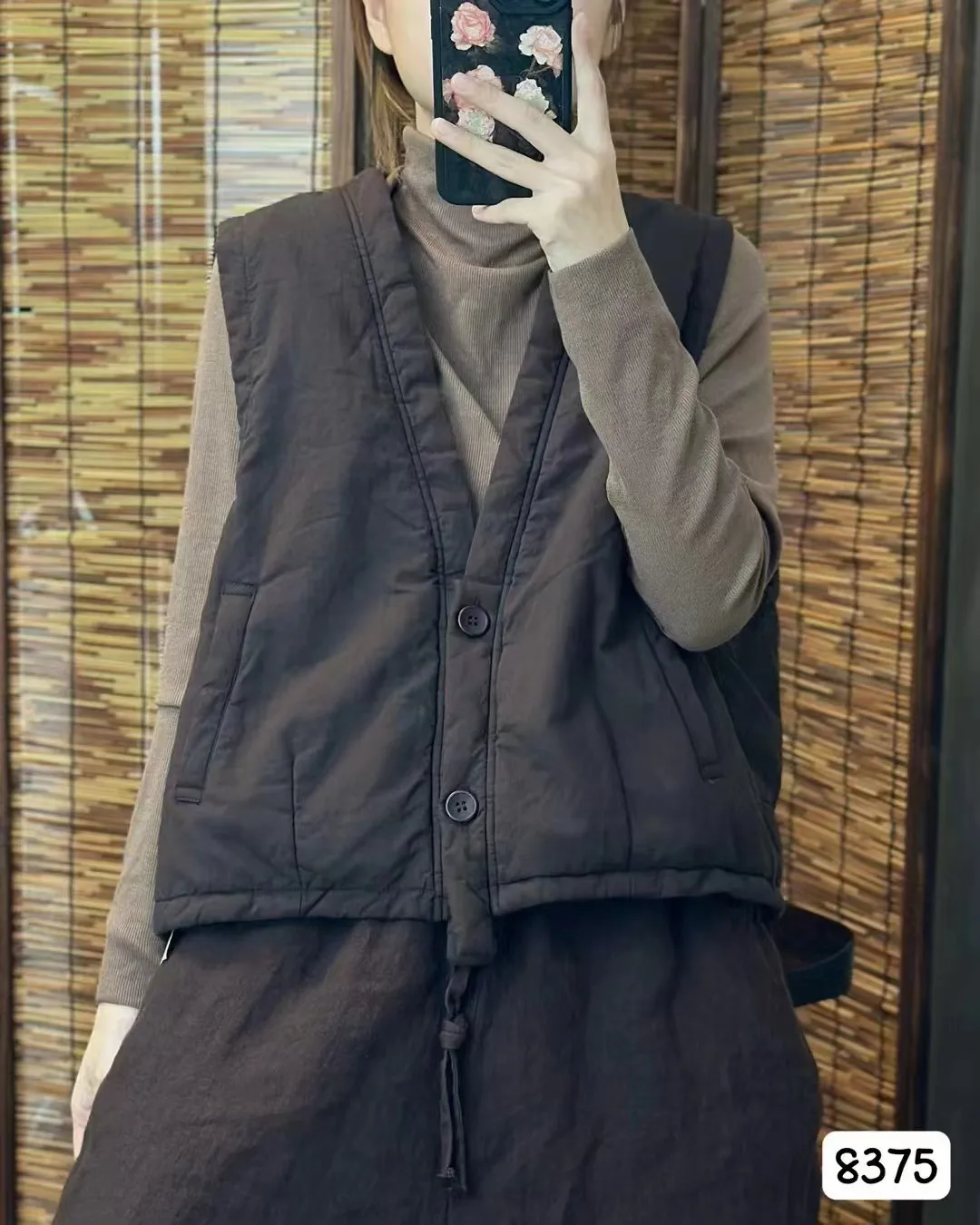 衣都精品- 新款簡約純色V領夾棉馬甲外套