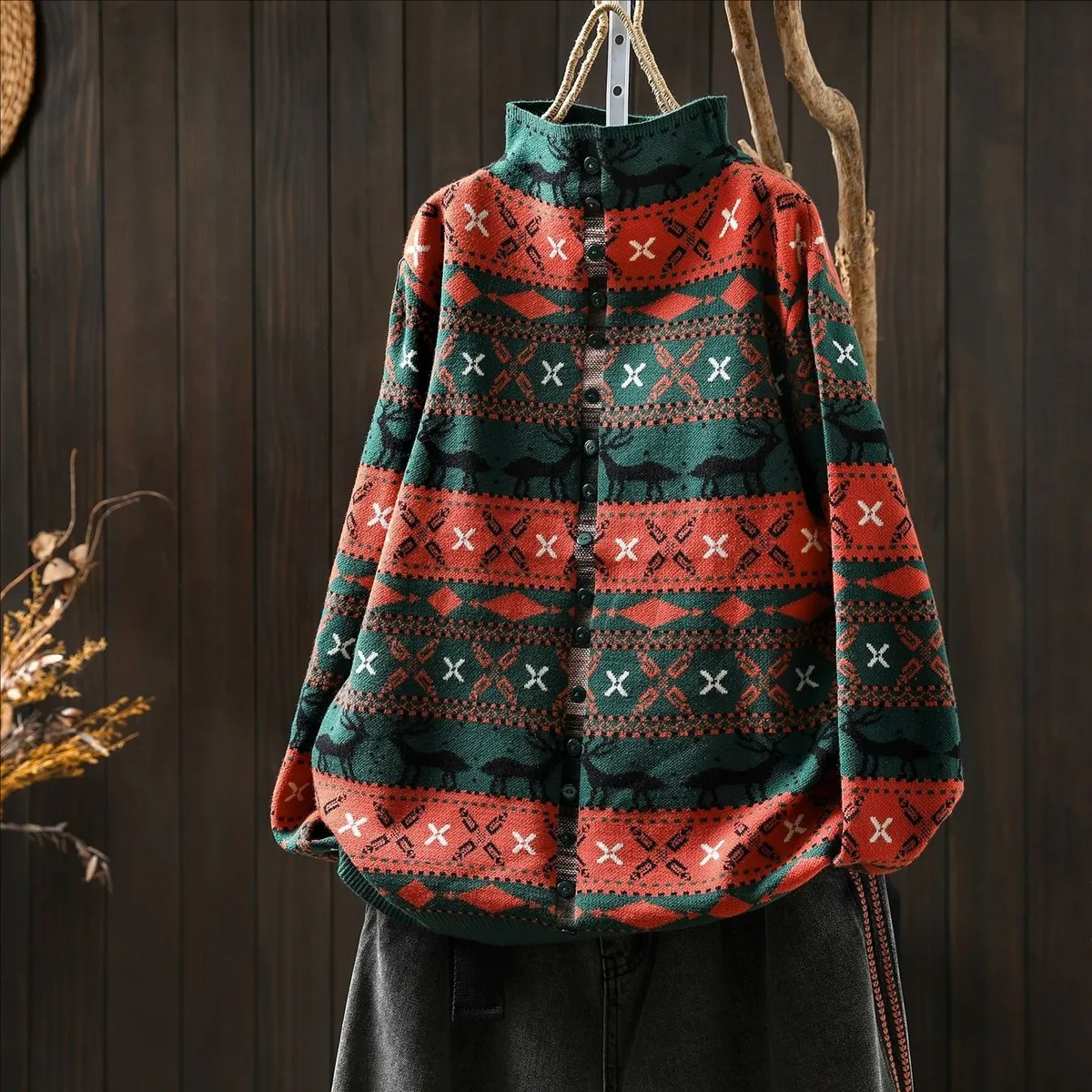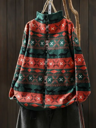 衣都精品- 新款大碼寬鬆印花復古盤扣半高領假兩件外套
