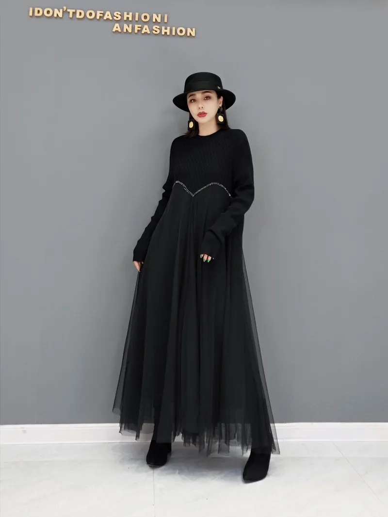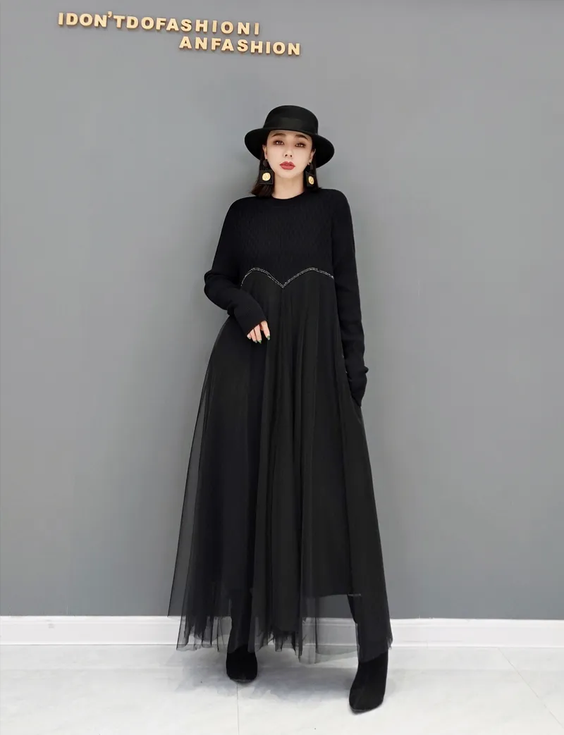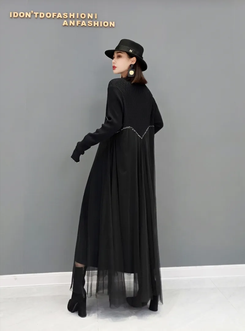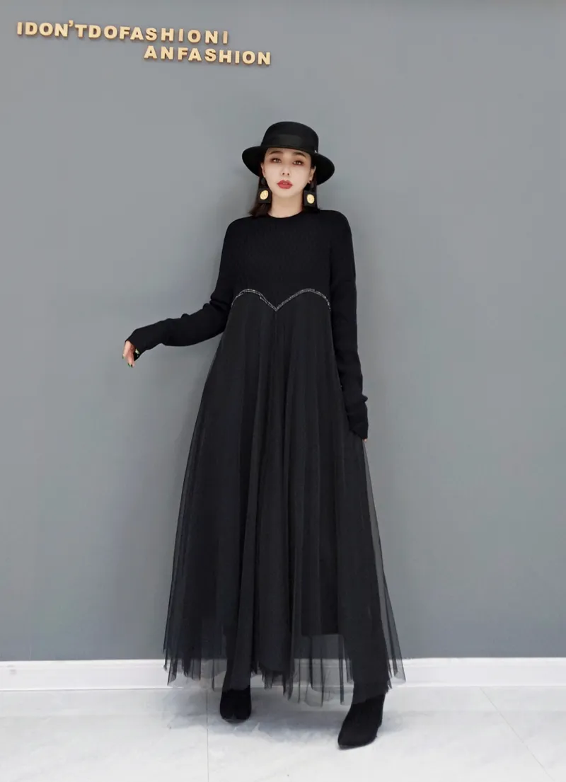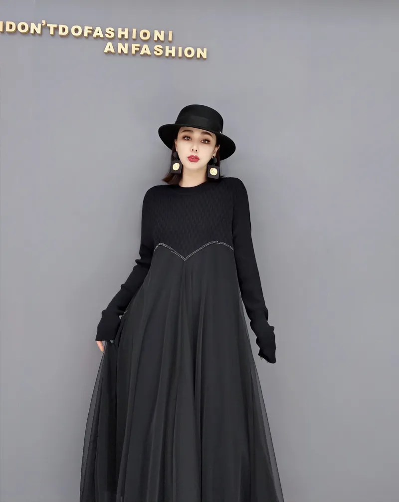 衣都精品- 2022冬季新款寬鬆休閒毛衣網紗時尚連衣裙