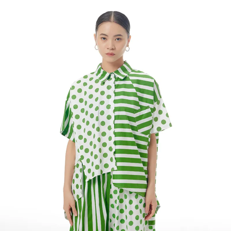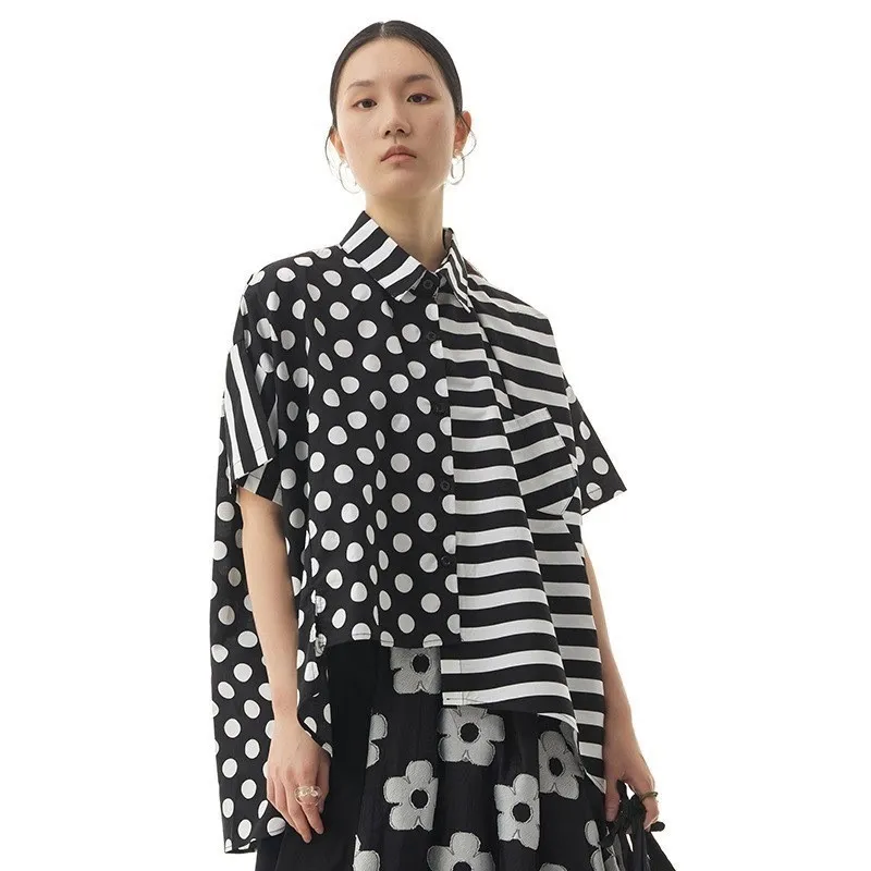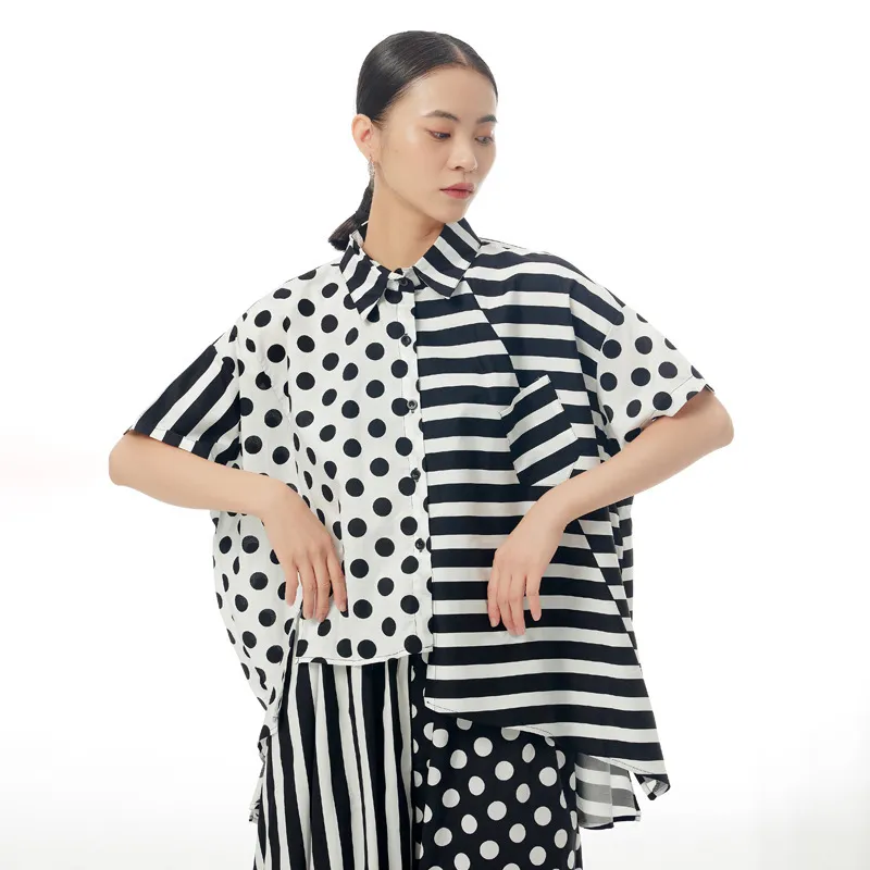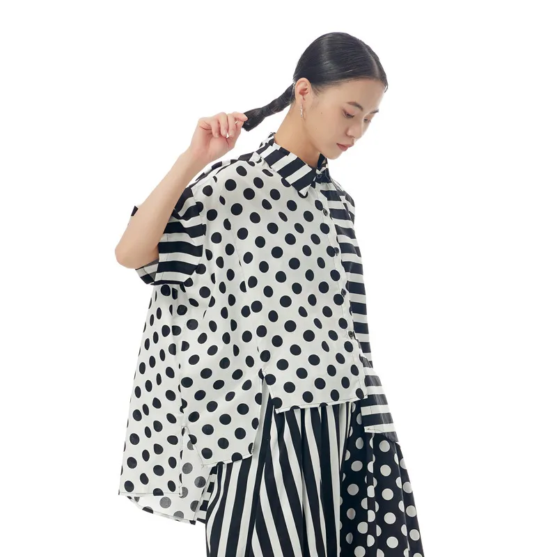 衣都精品- 2023新款寬鬆顯瘦波點條紋不規則拼接上衣