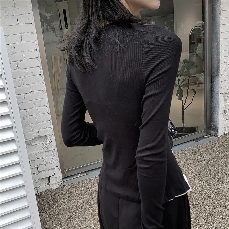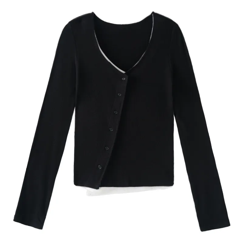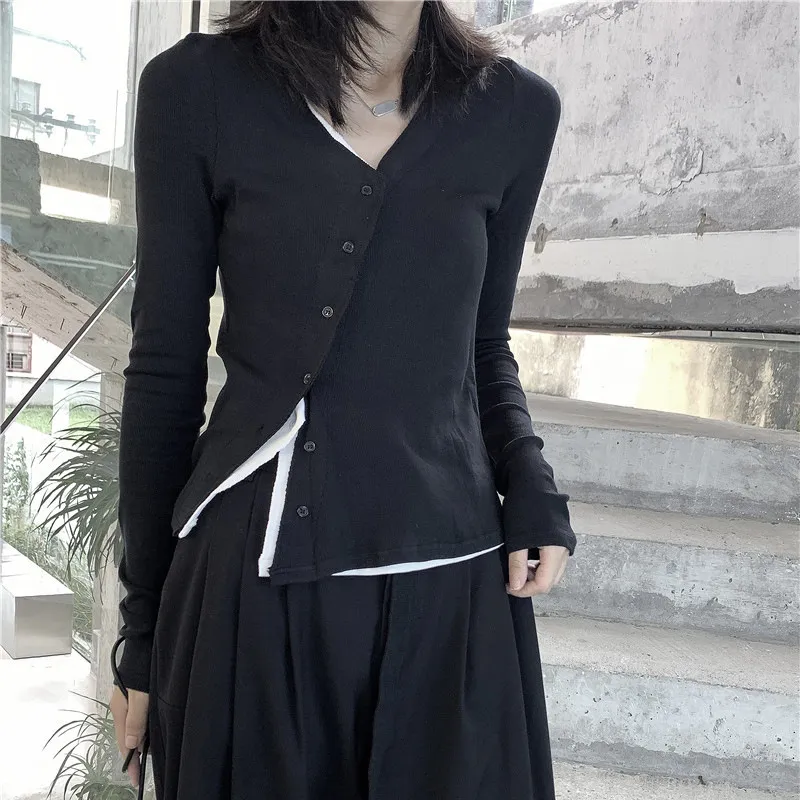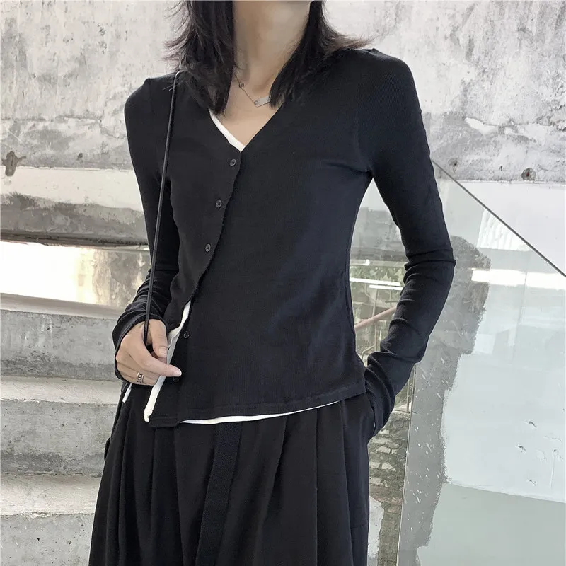衣都精品- 2023新款暗黑假兩件V領修身顯瘦上衣