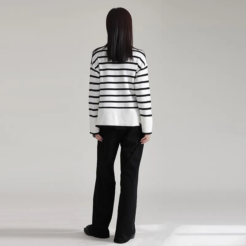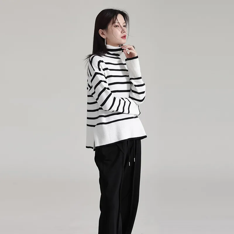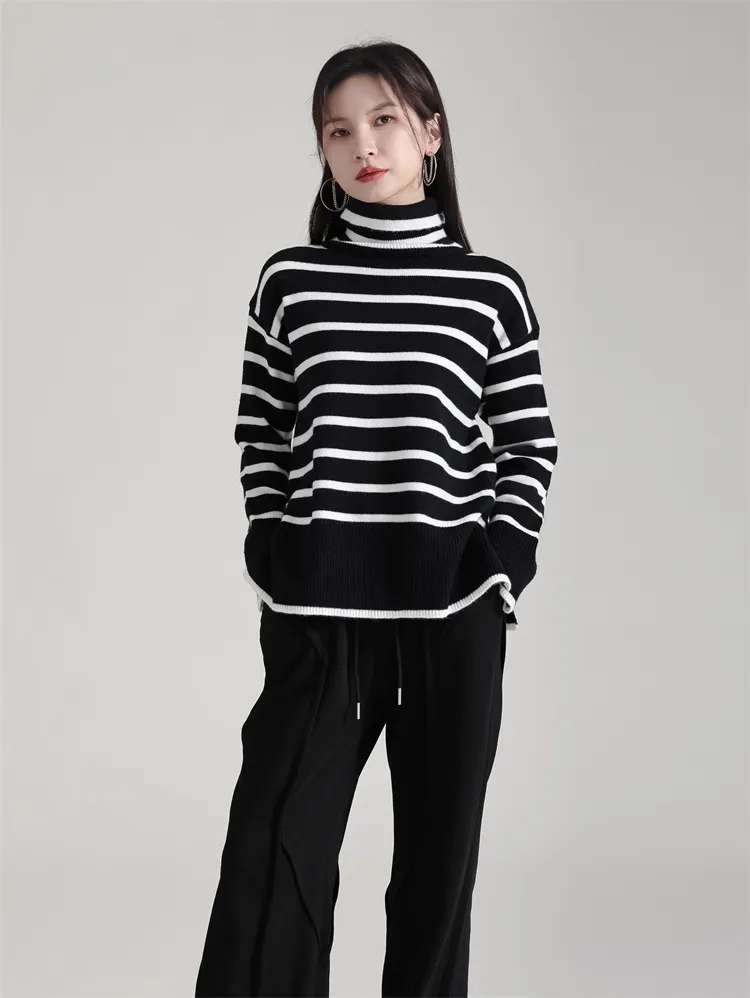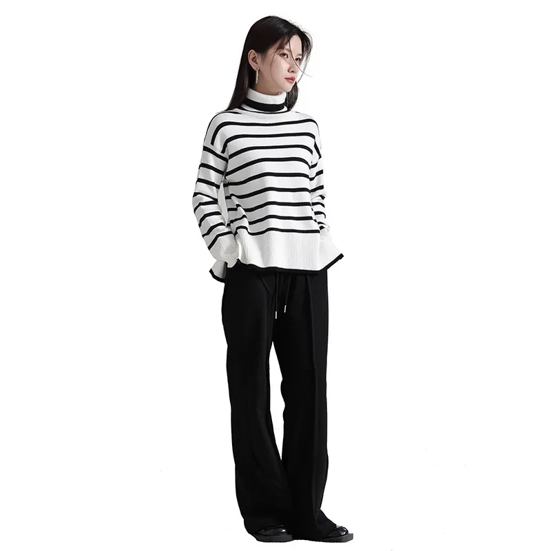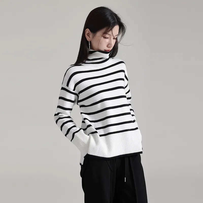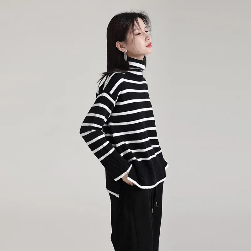衣都精品- 2023新款慵懶風高領條紋撞色寬鬆上衣