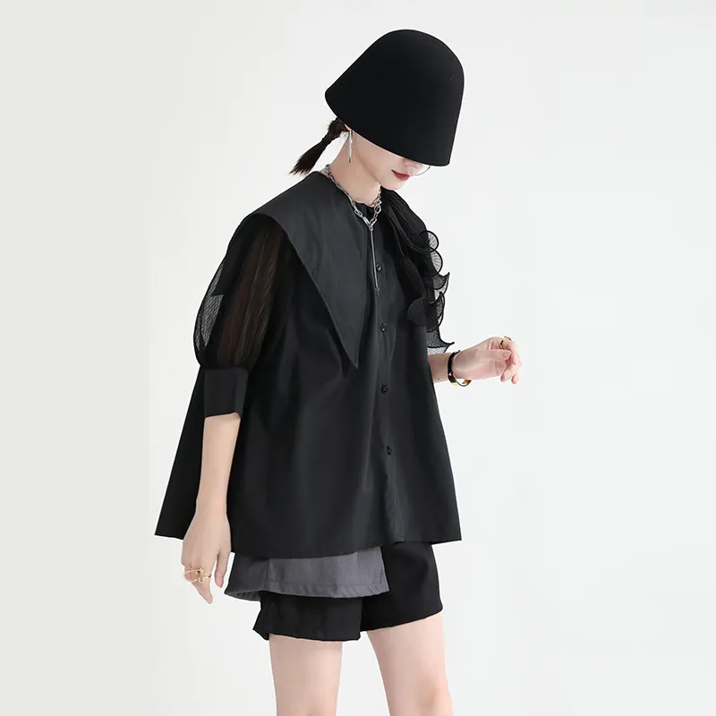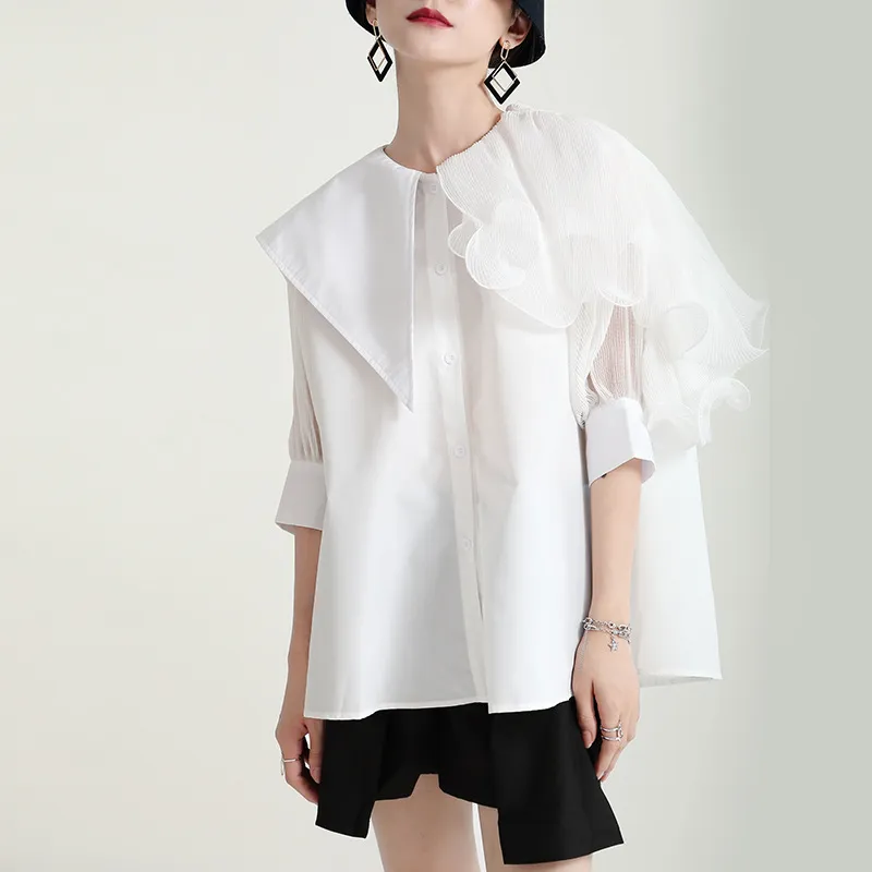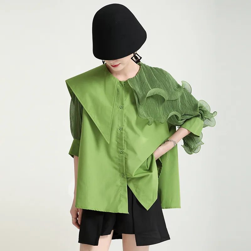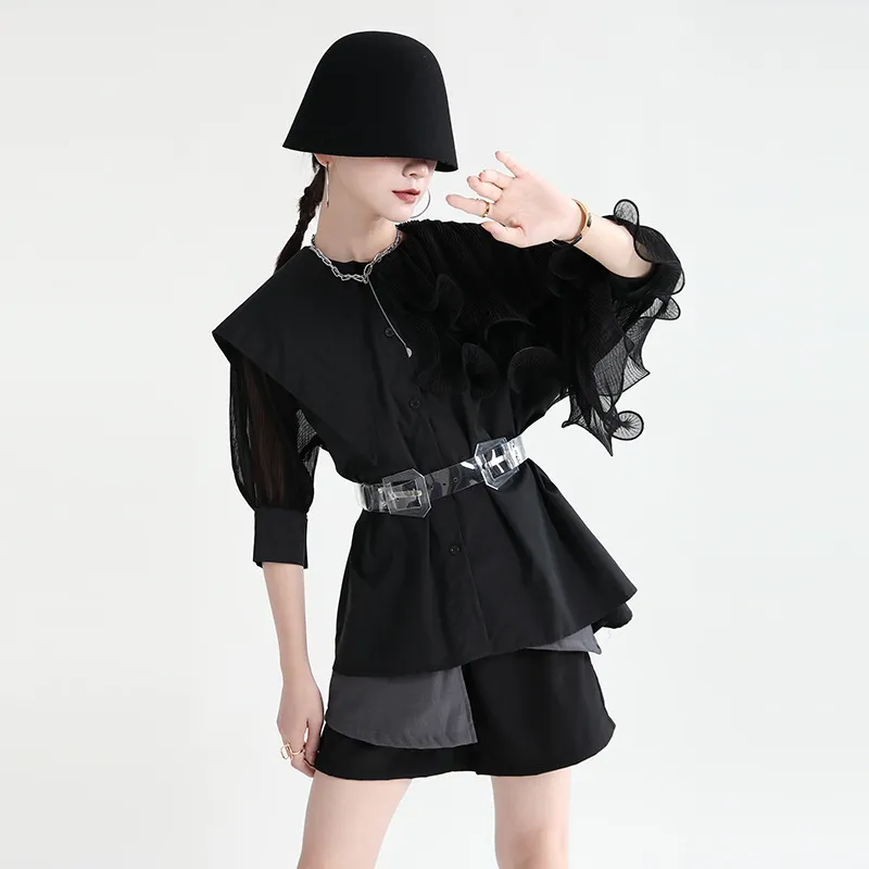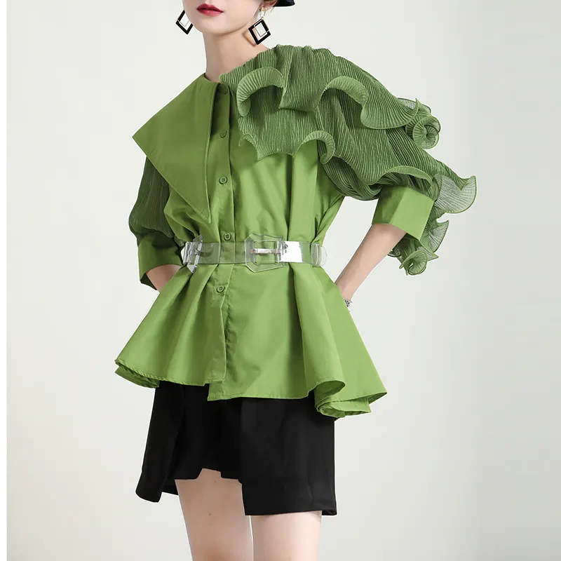 衣都精品- 2023新款翻領皺褶卷荷葉邊不規則拼接上衣