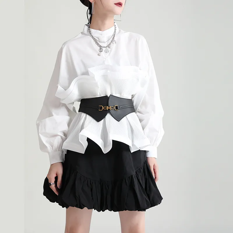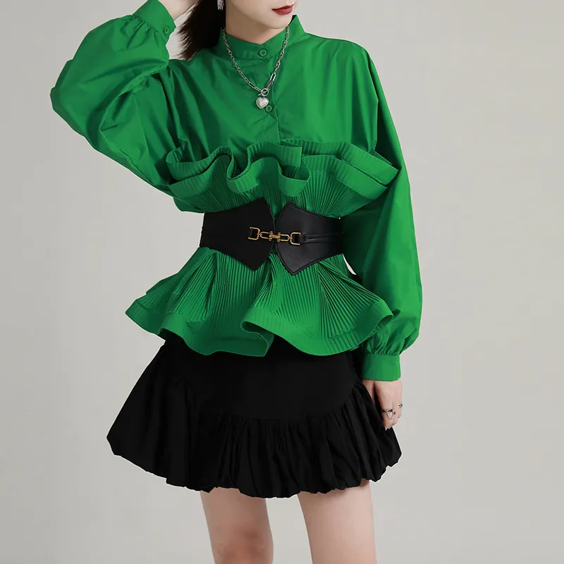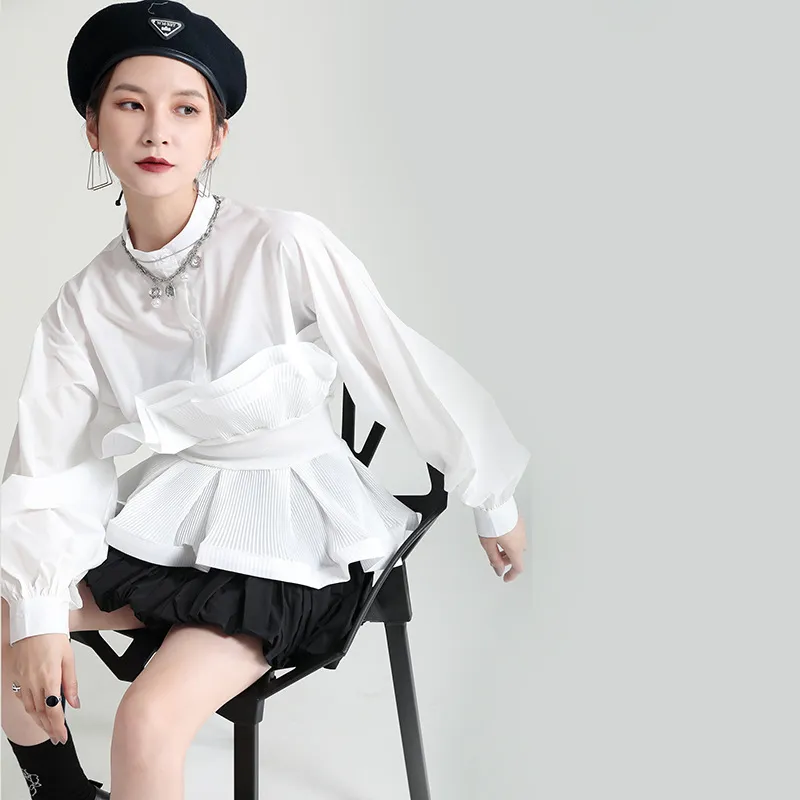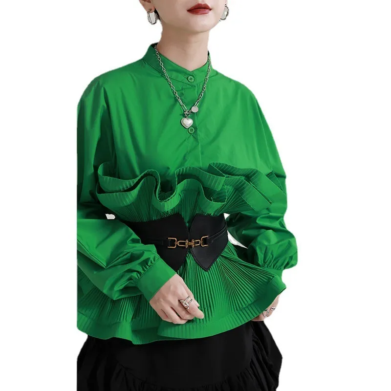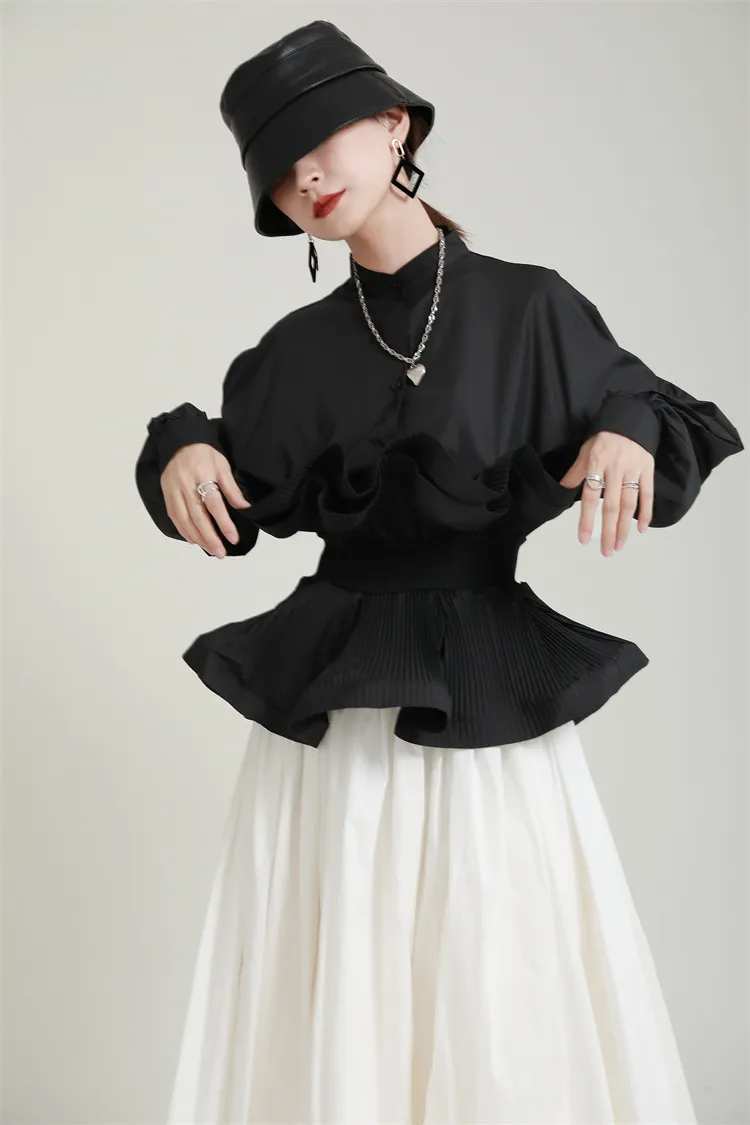 衣都精品- 2023新款翻領皺褶卷荷葉邊不規則拼接上衣