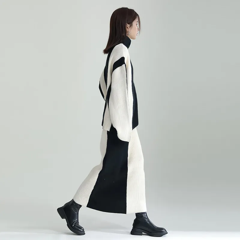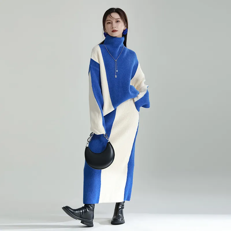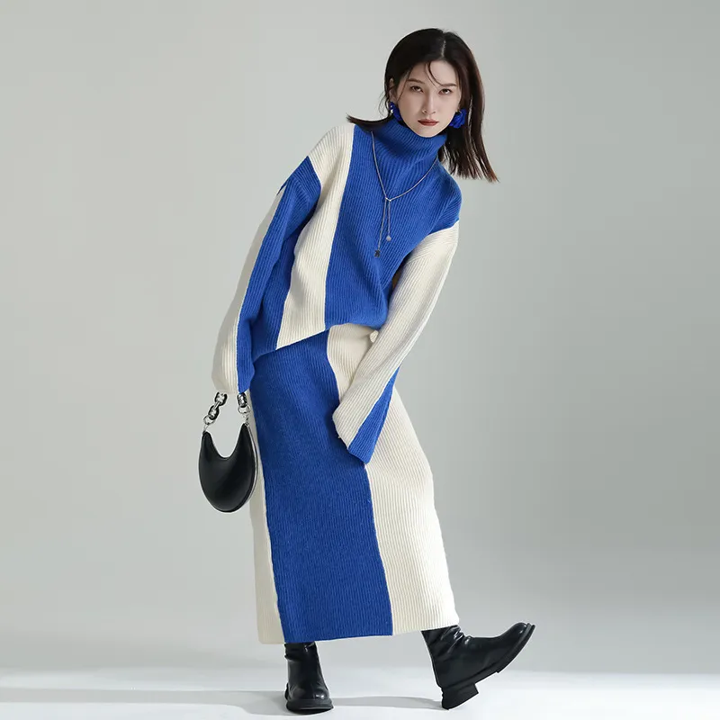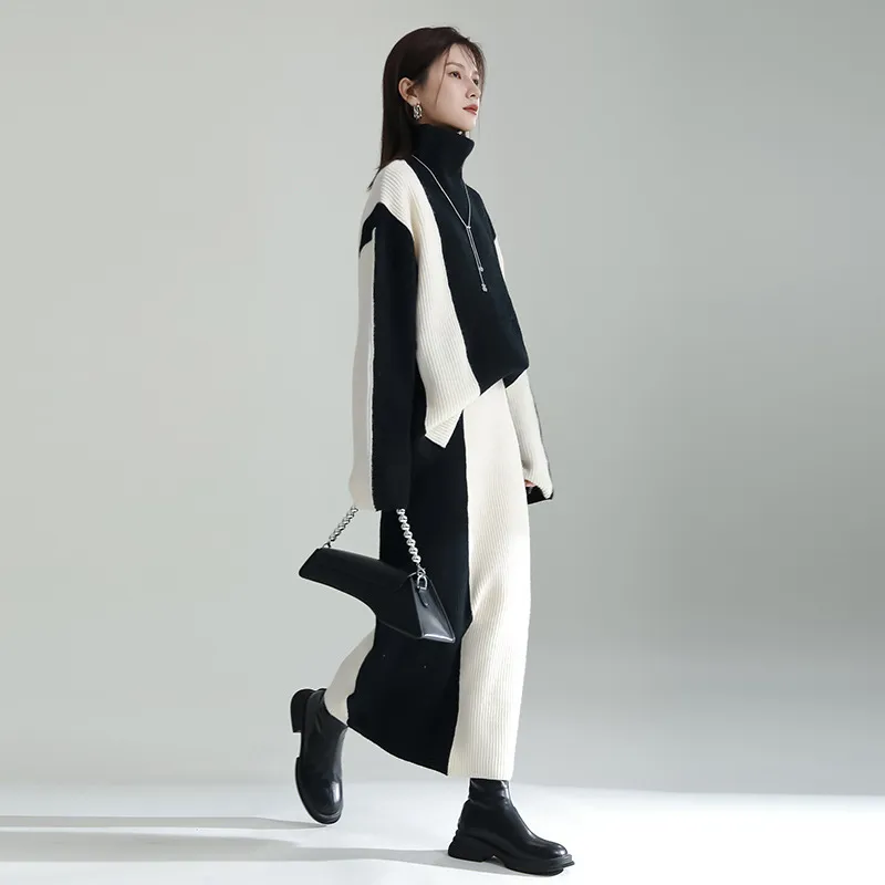 衣都精品- 2023新款高領長袖撞色拼接毛衣+半身裙套裝