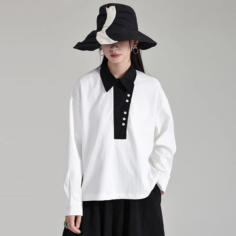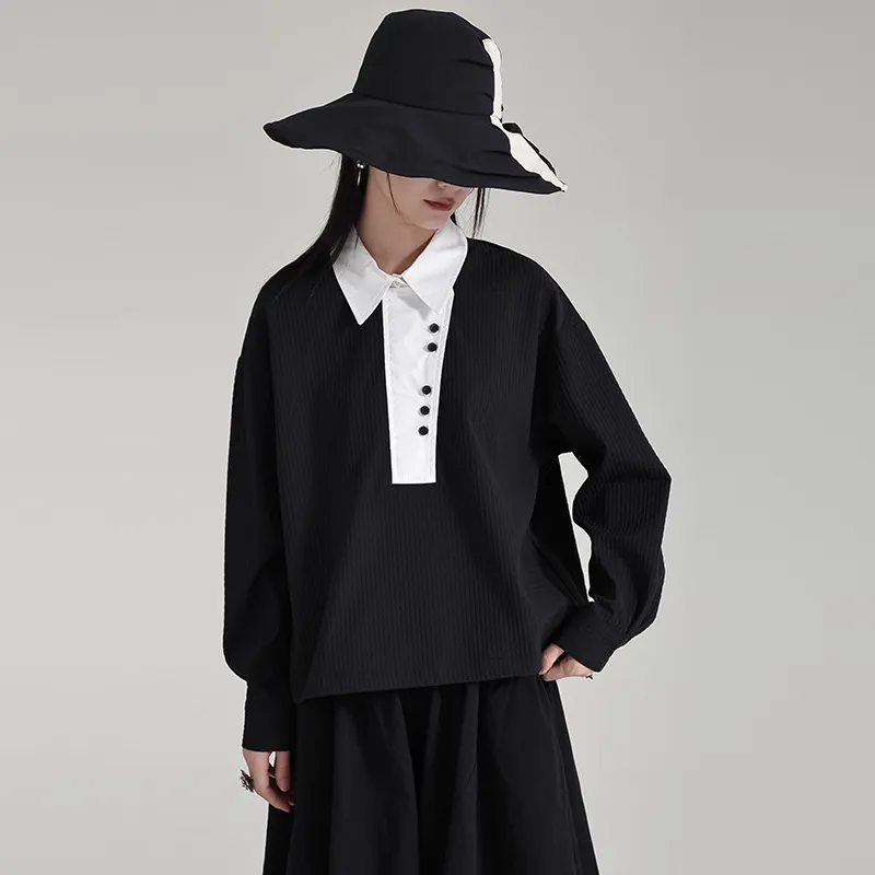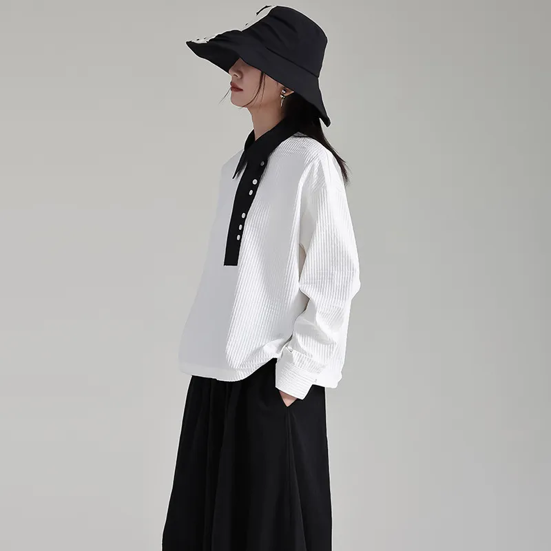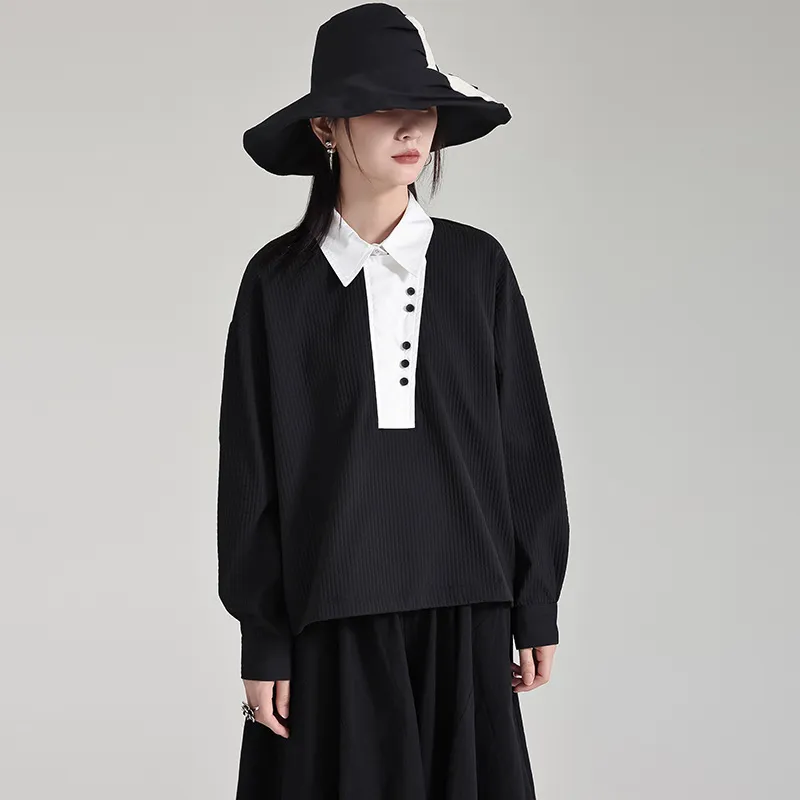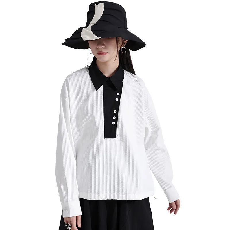 衣都精品- 2023新款撞色翻領抽繩寬鬆長袖上衣