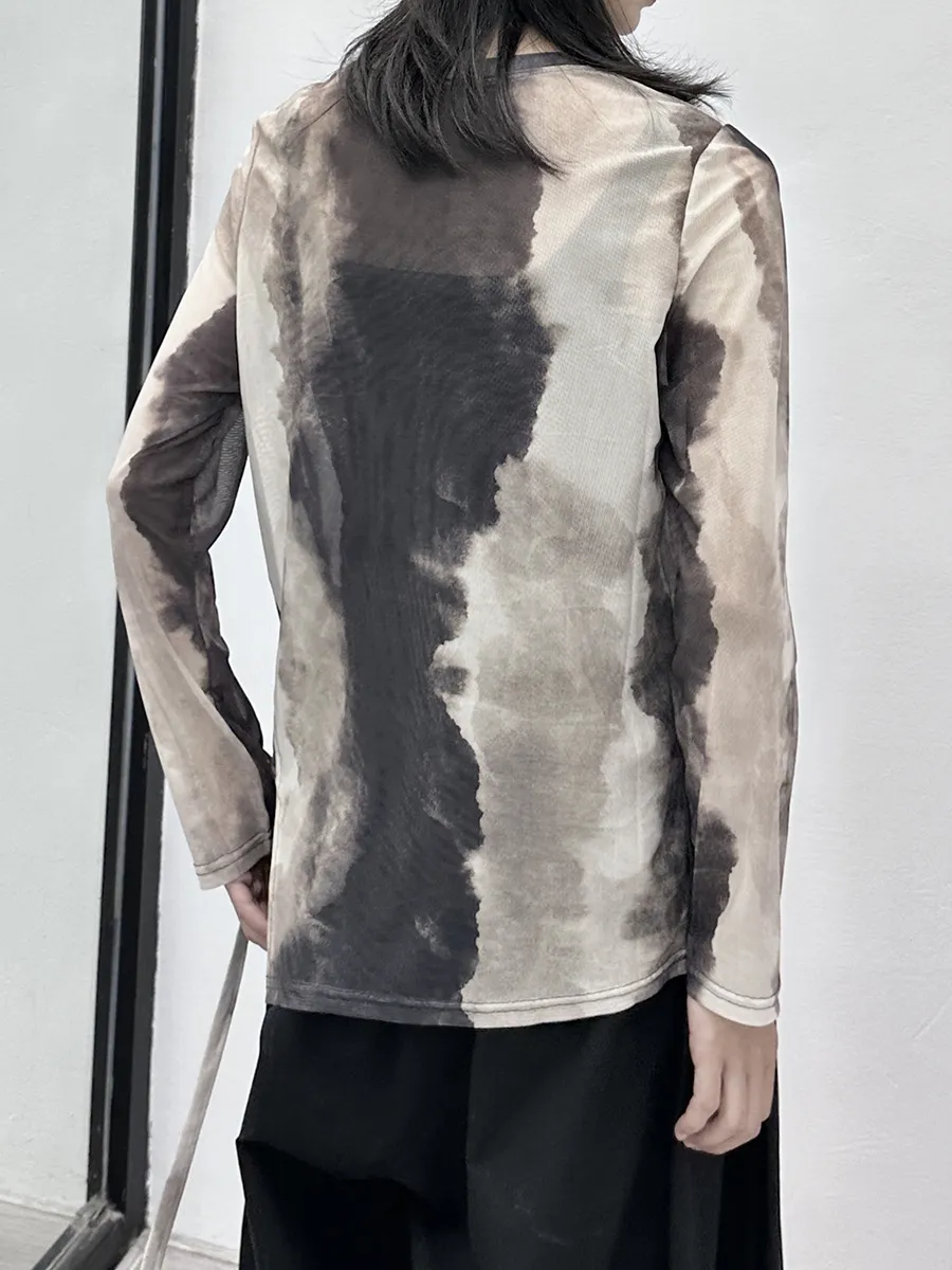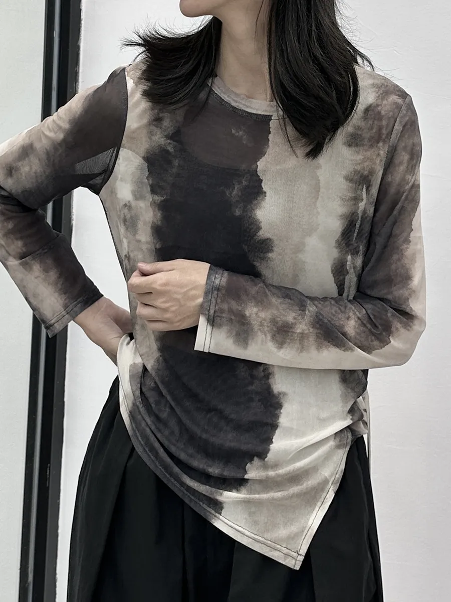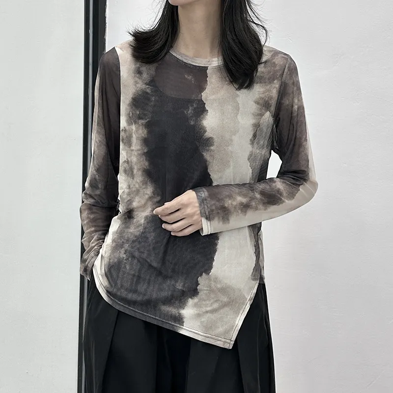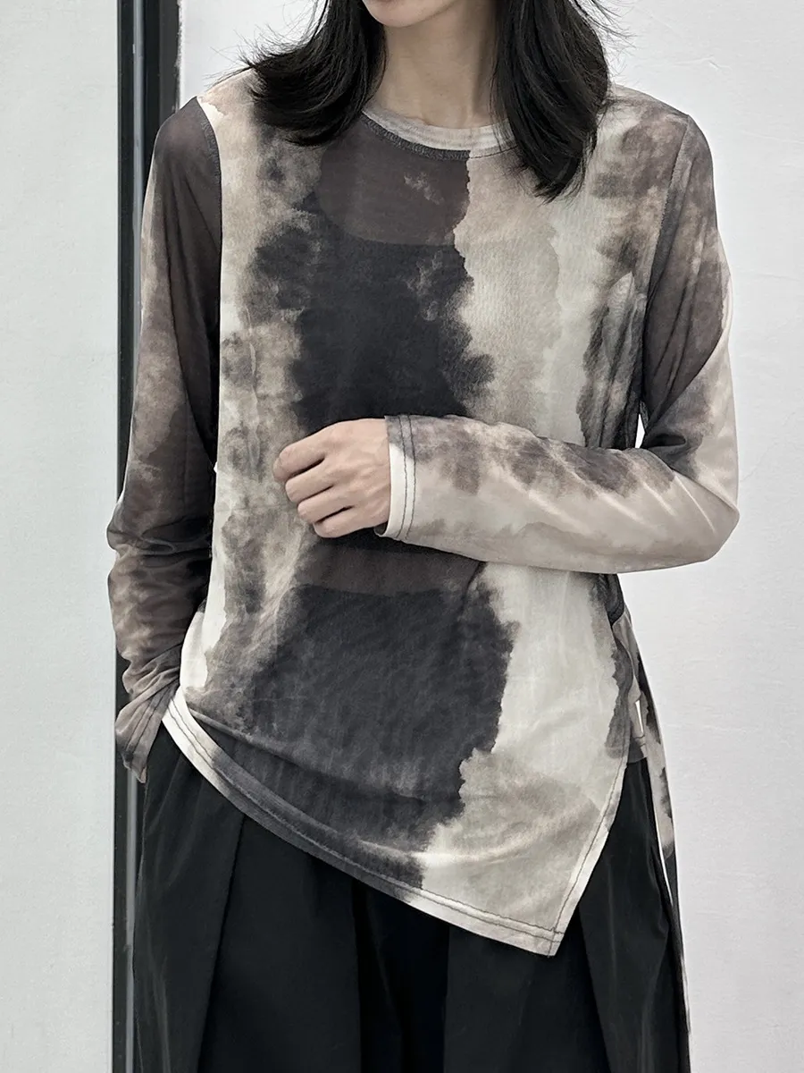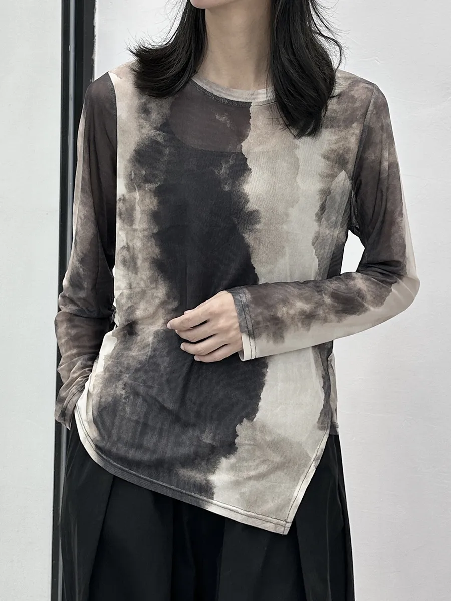 衣都精品- 2023新款暈染網紗不規則休閒長袖上衣