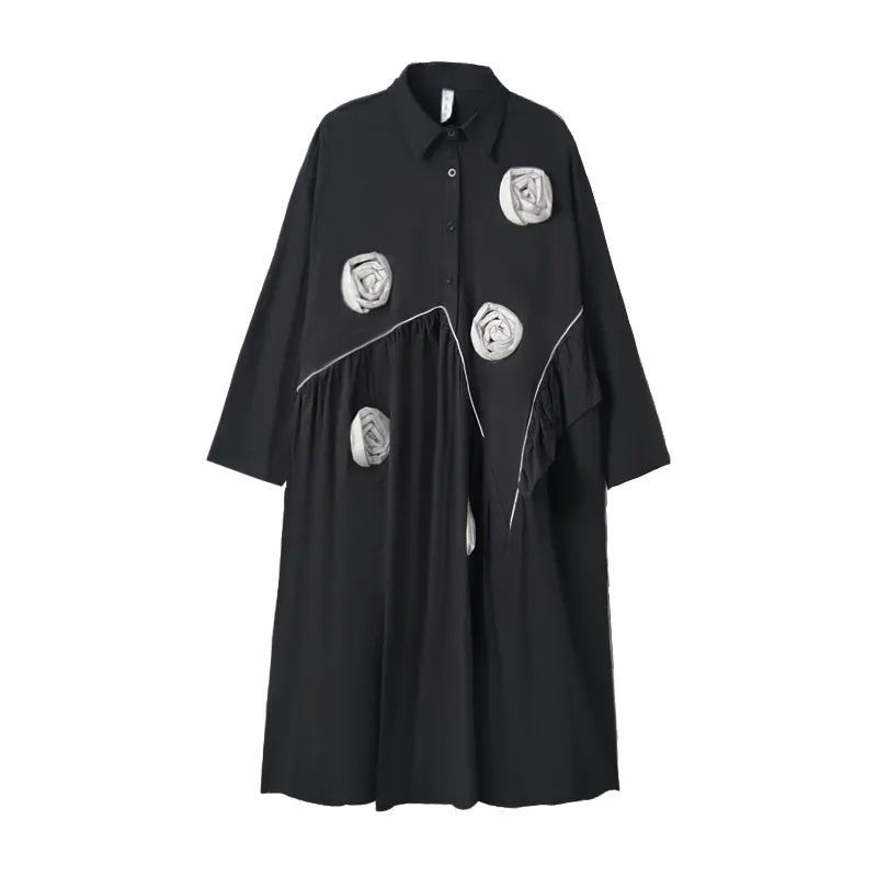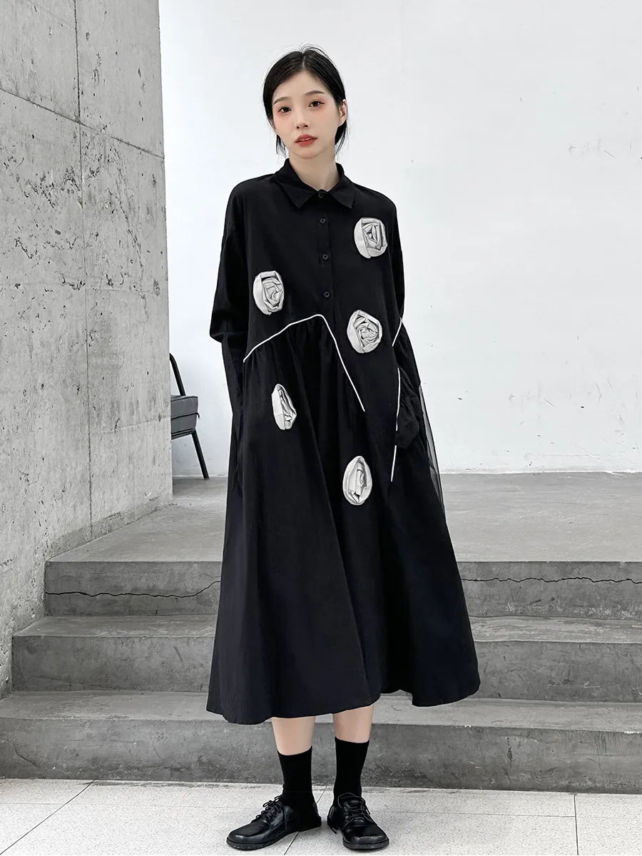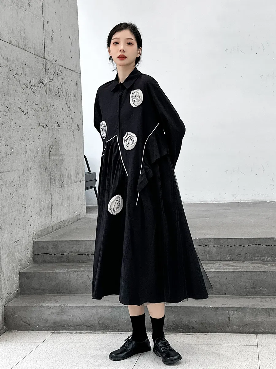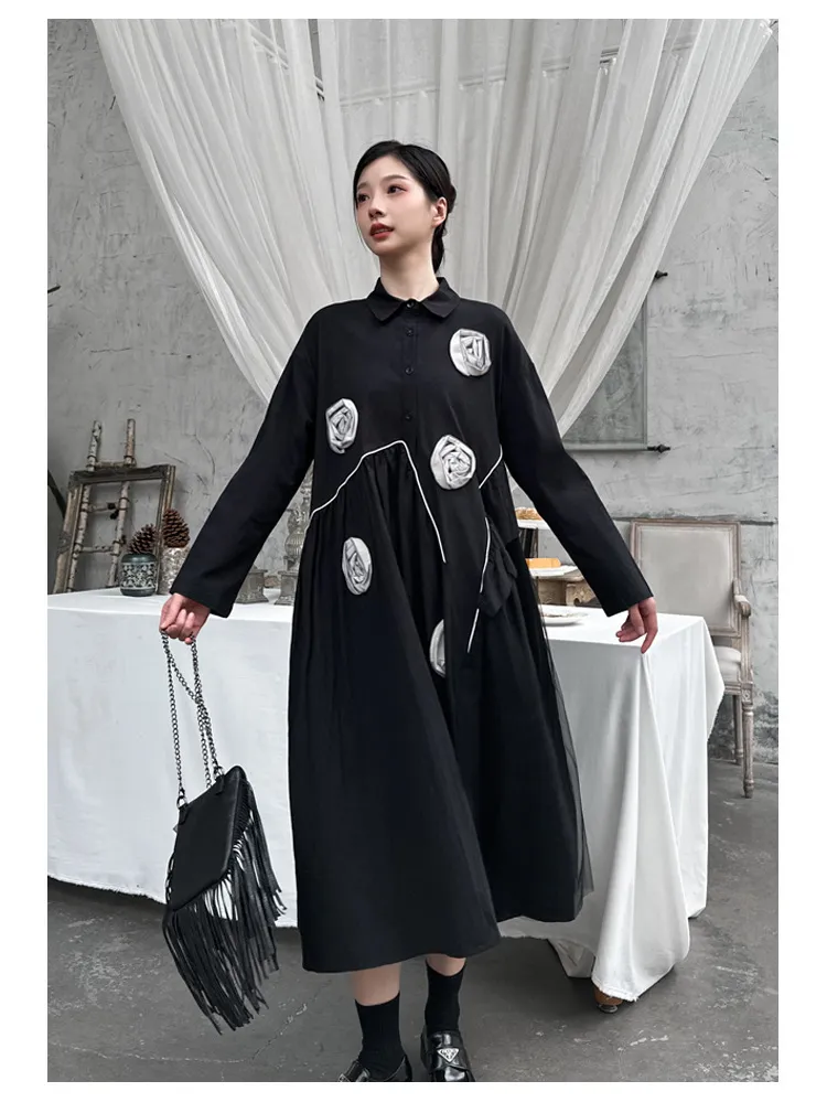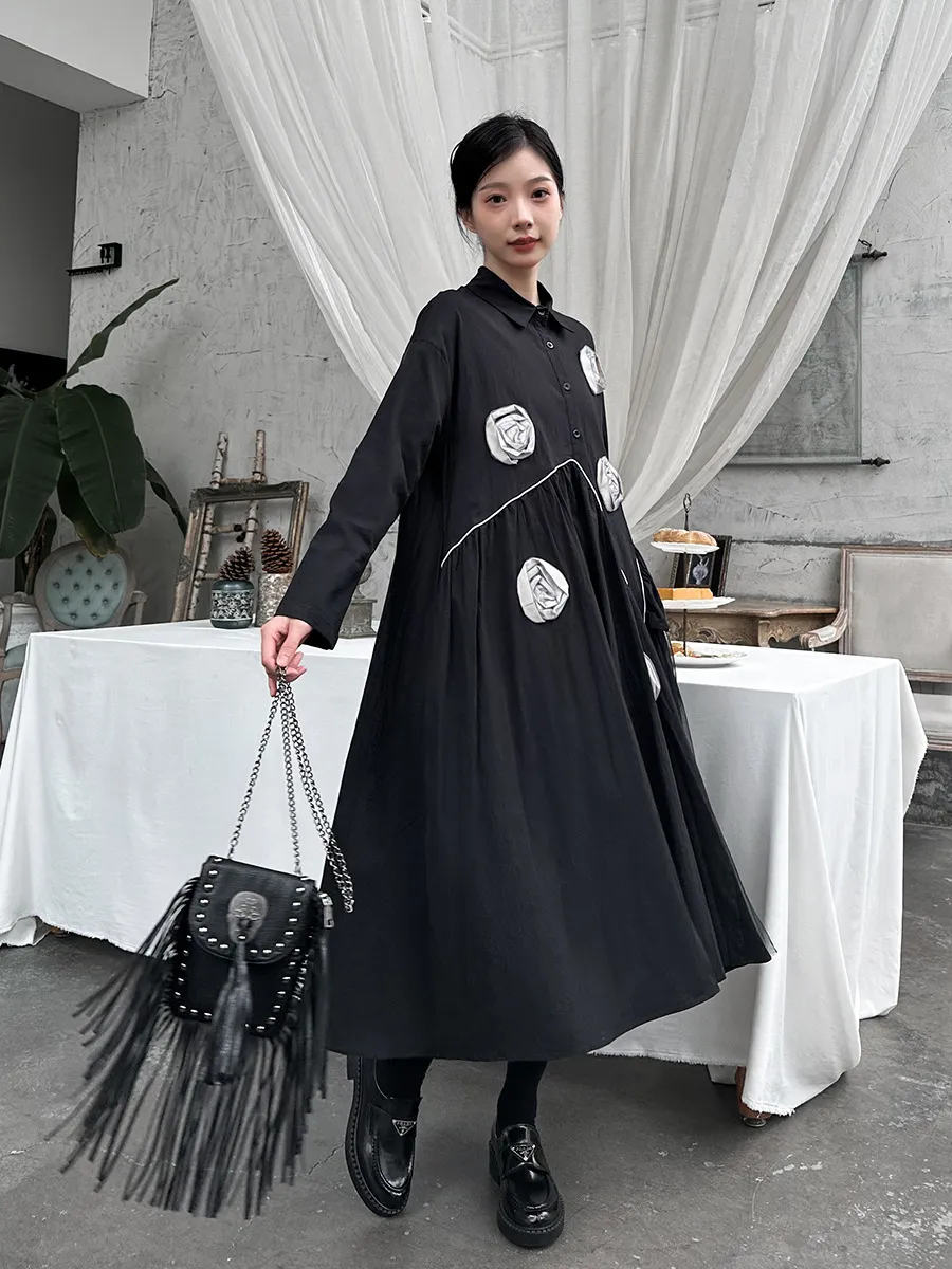 衣都精品- 2023新款暗黑風立體花朵設計寬鬆連衣裙