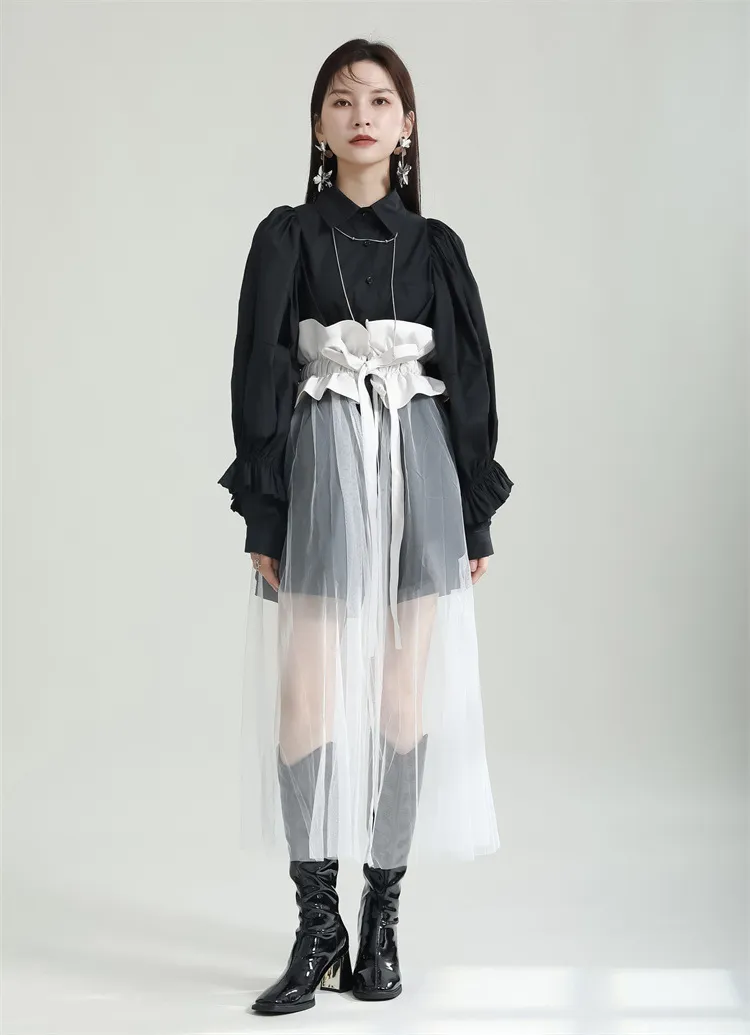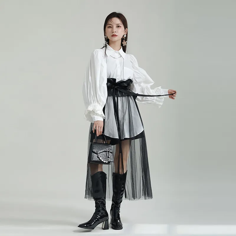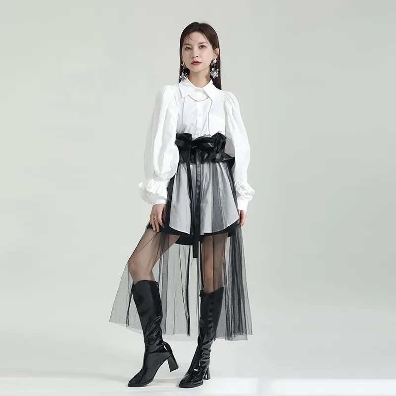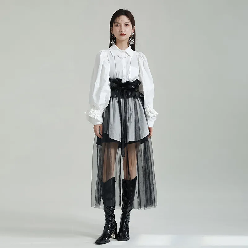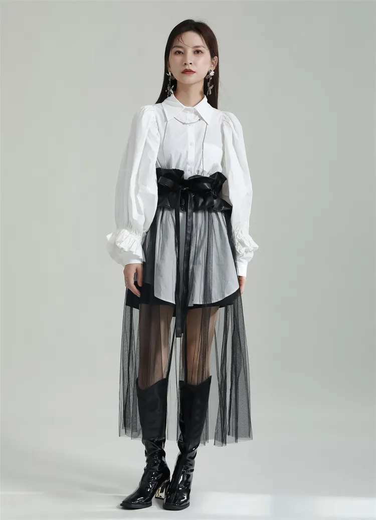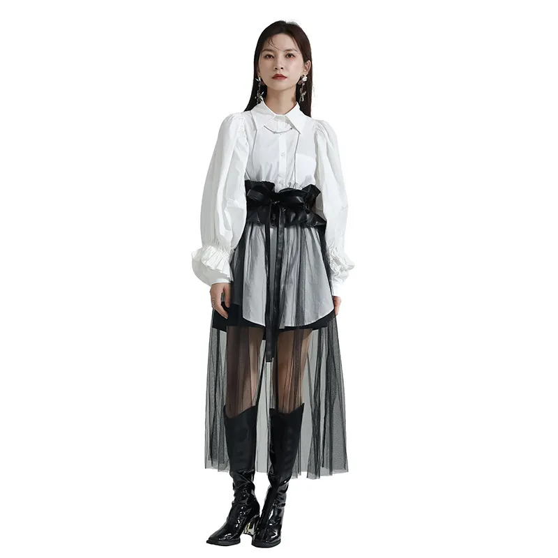衣都精品- 2023新款設計感PU拼接網紗腰封+白色襯衫