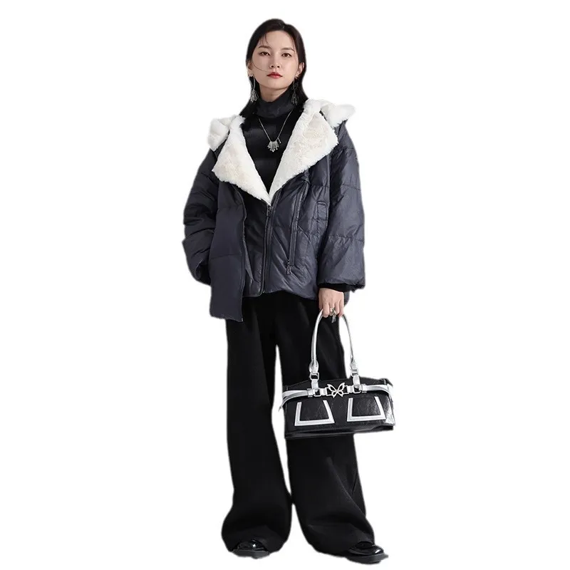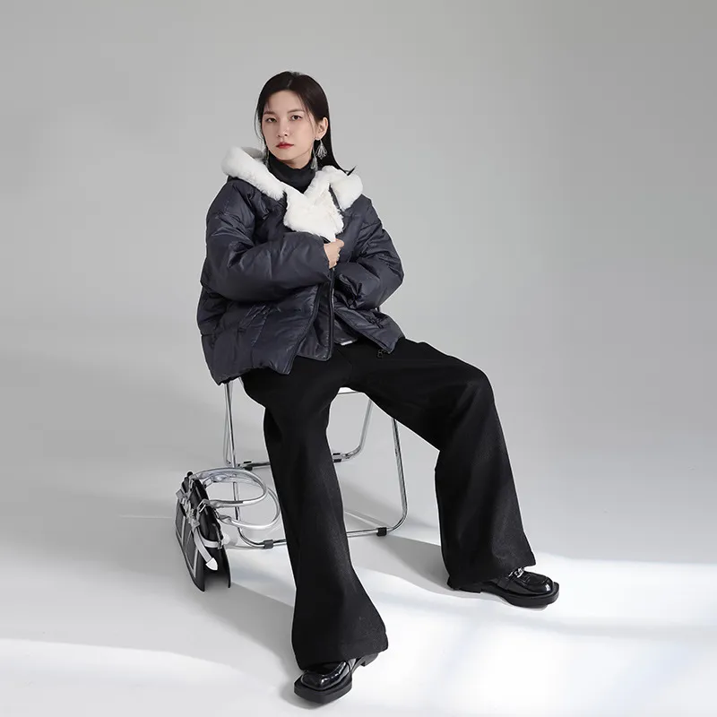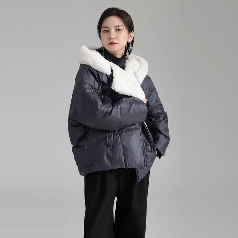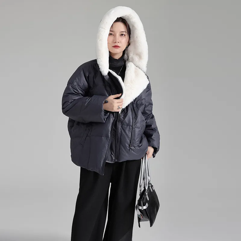 衣都精品- 2023新款撞色連帽毛領短版羽絨外套