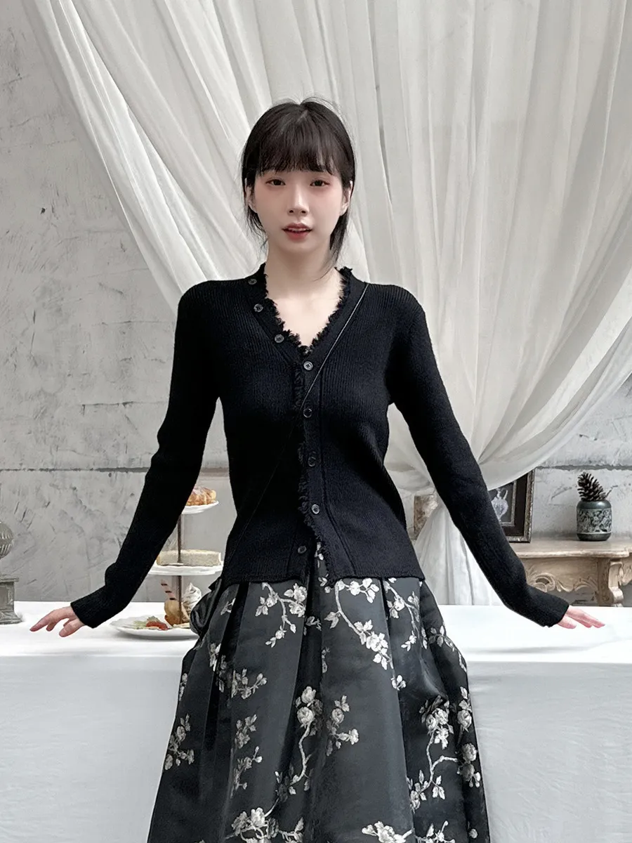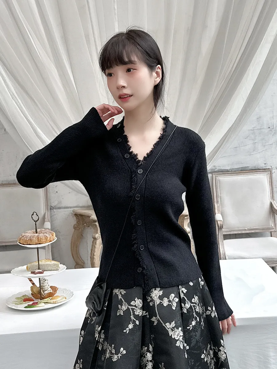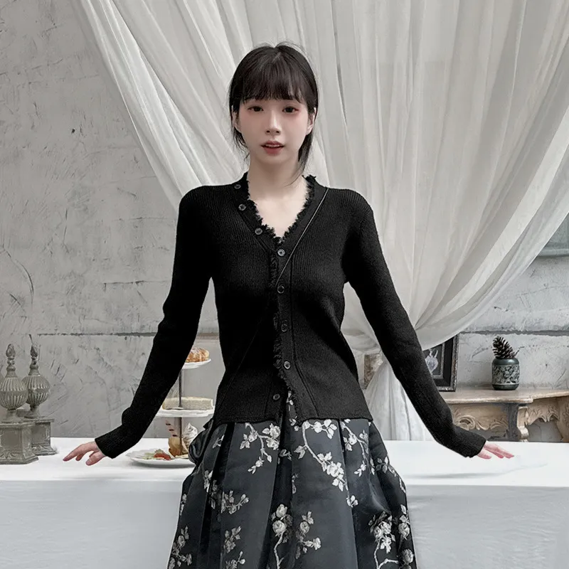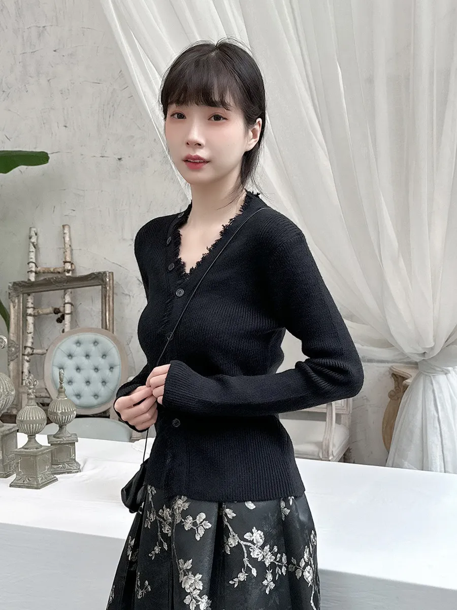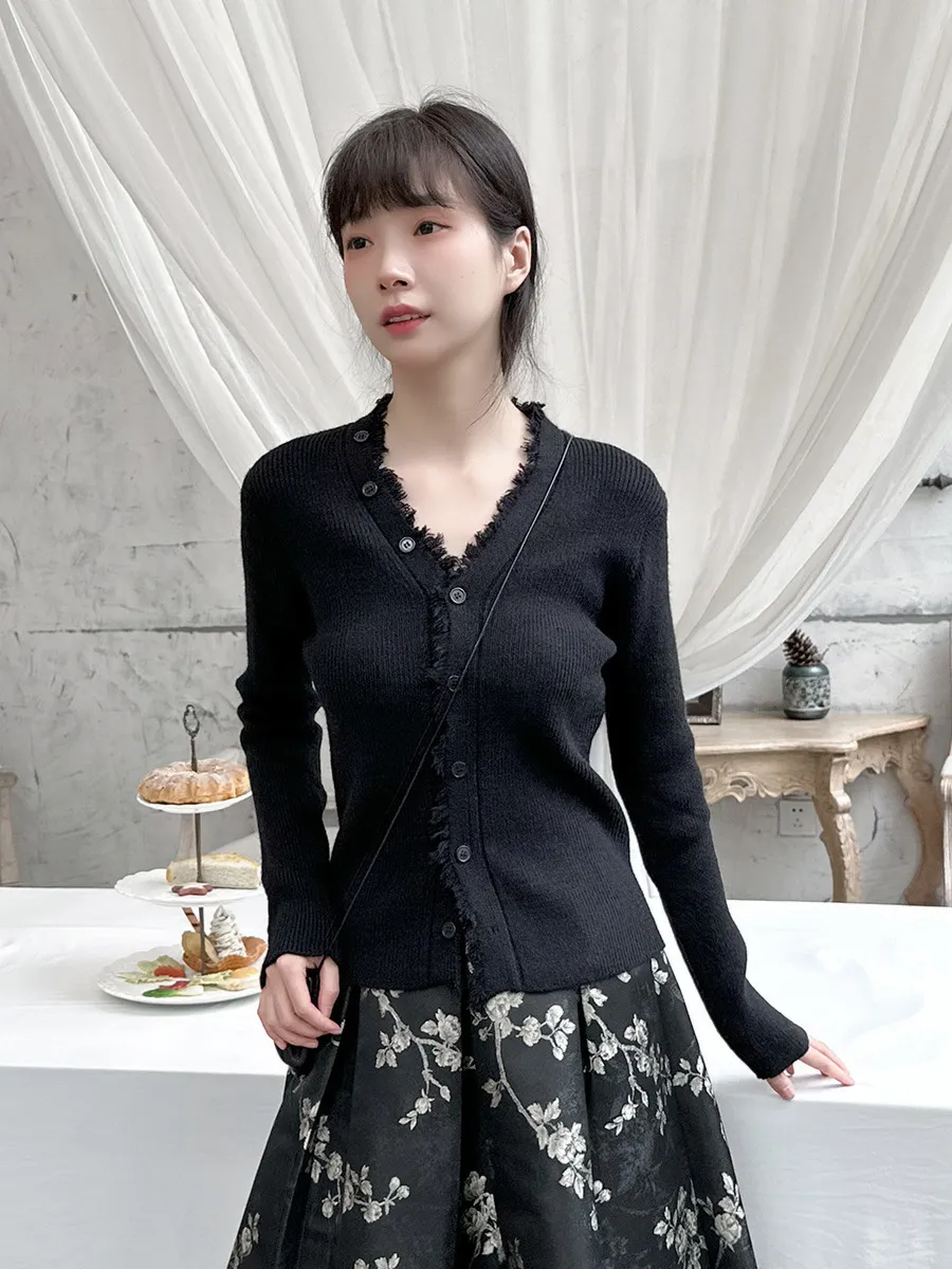衣都精品- 2023新款慵懶風V領修身流蘇毛邊毛衣外套