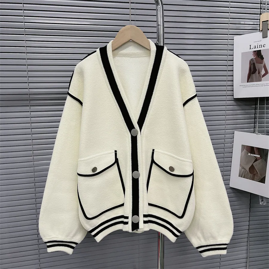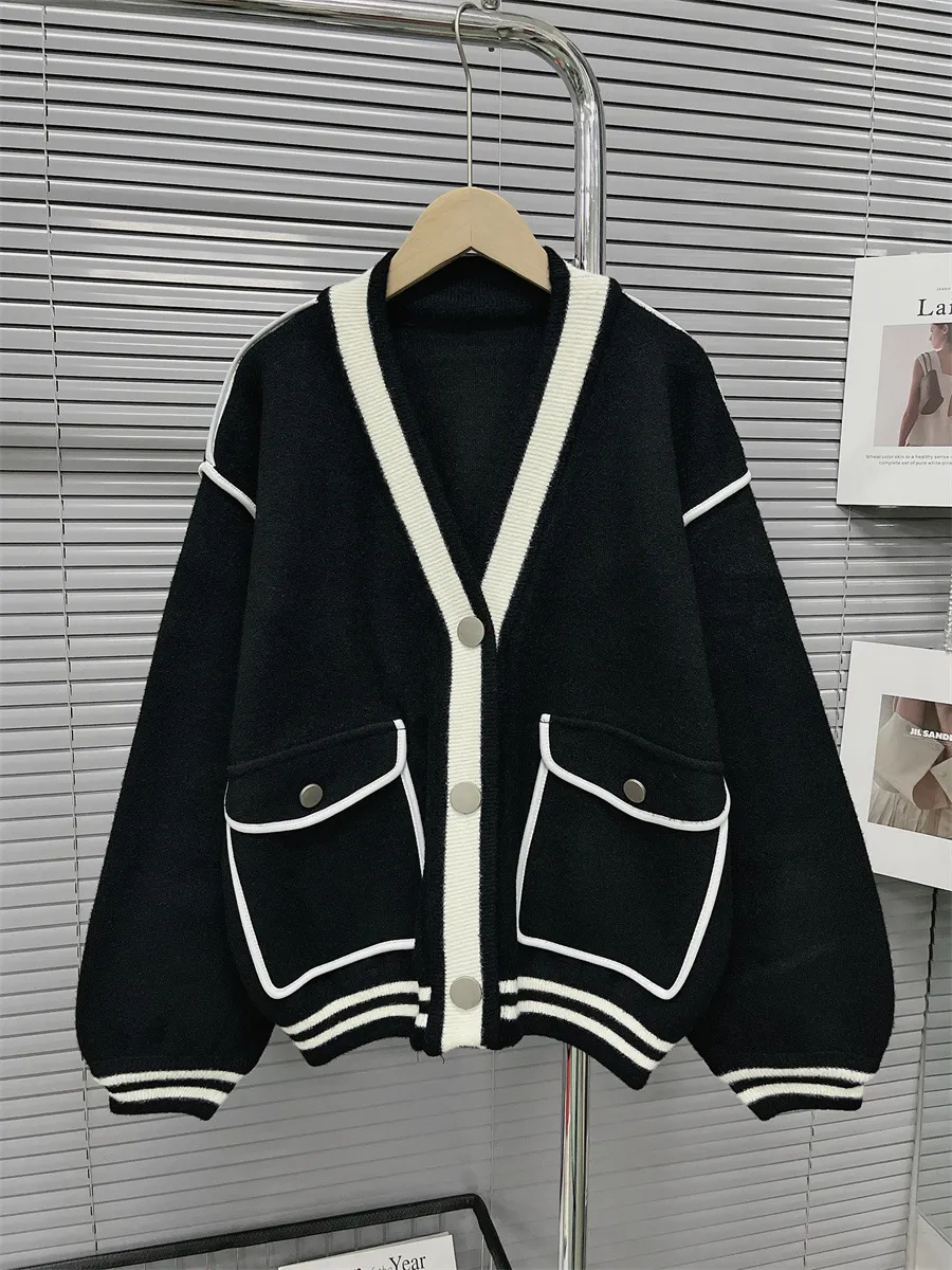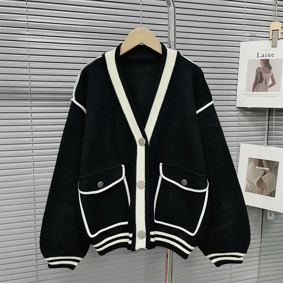 衣都精品- 2023新款復古慵懶風黑白玫瑰寬鬆毛衣外套