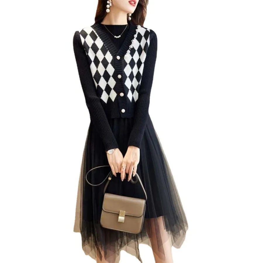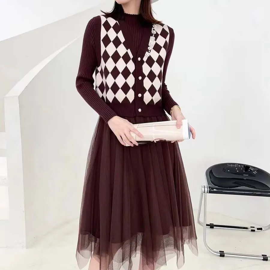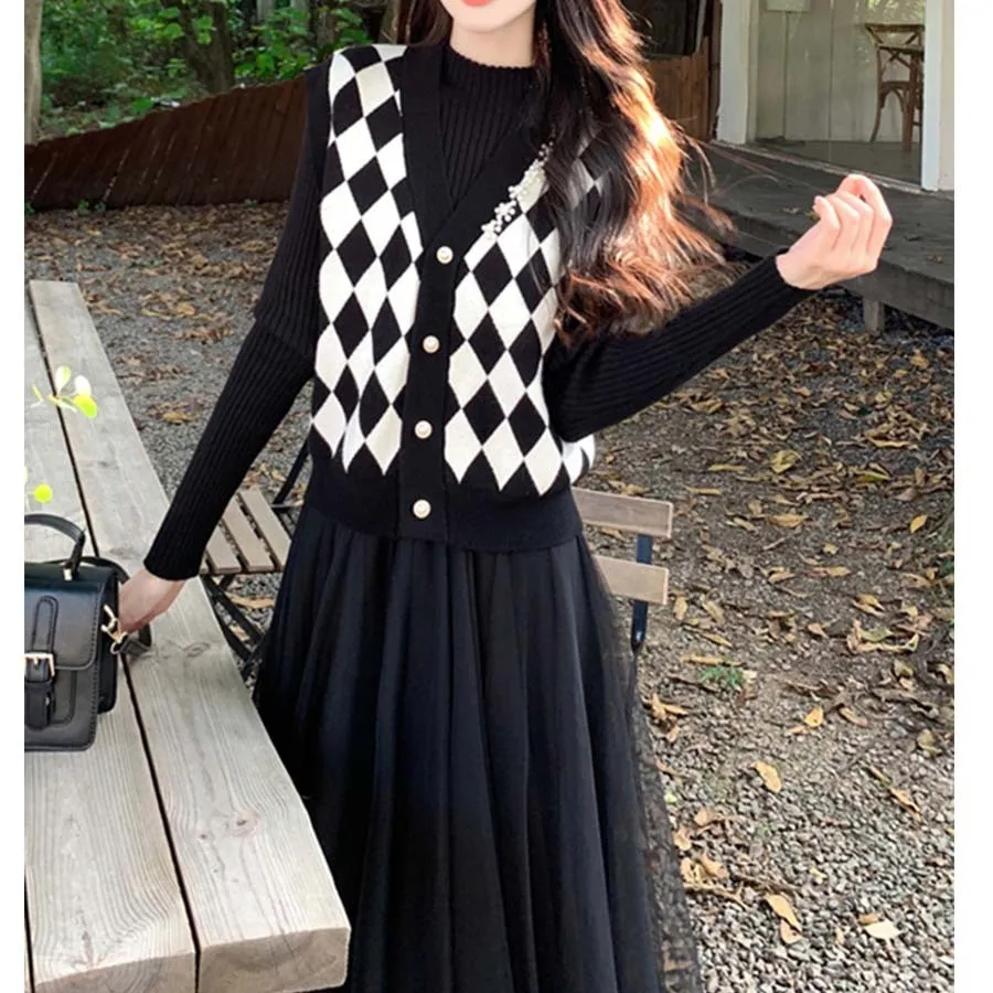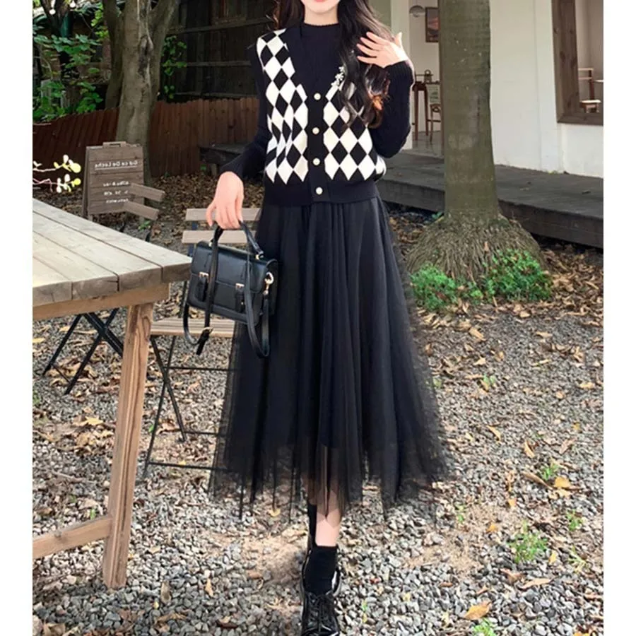 衣都精品- 2023新款名媛氣質菱格馬甲+網紗拼接半身裙兩件式套裝