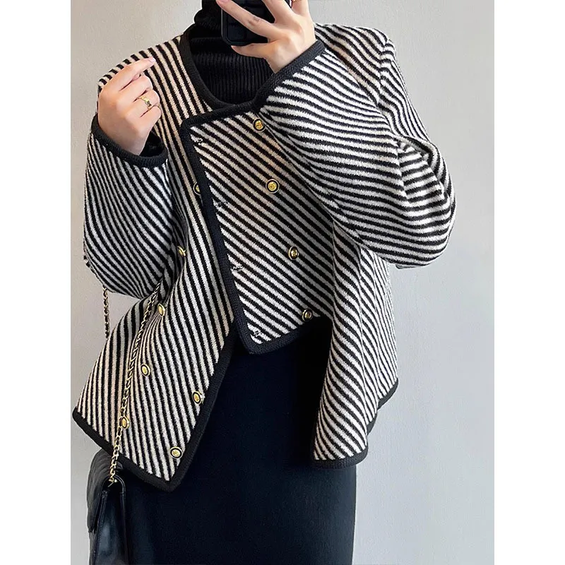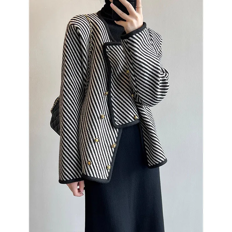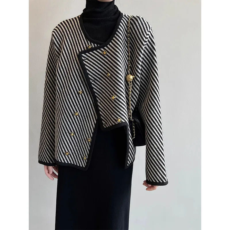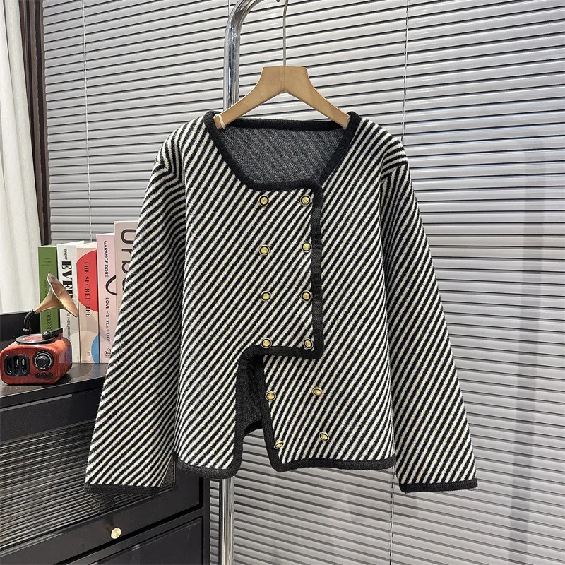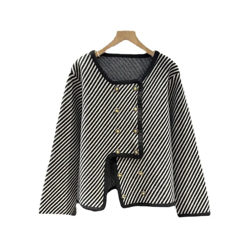 衣都精品- 2023新款斜條紋小香風不規則毛衣外套