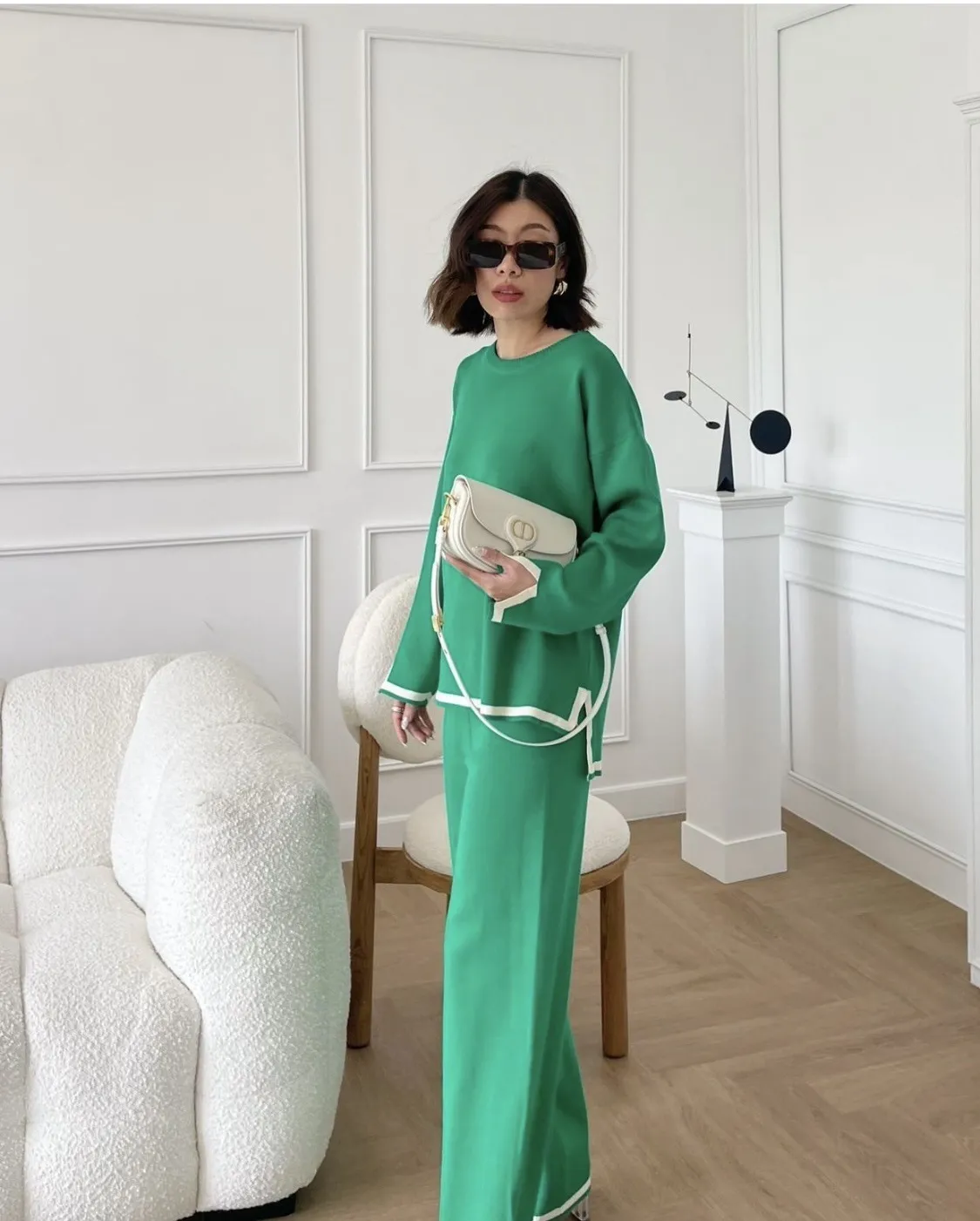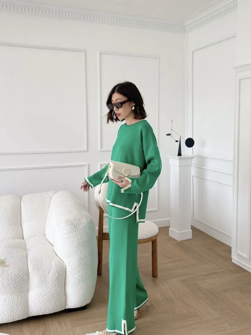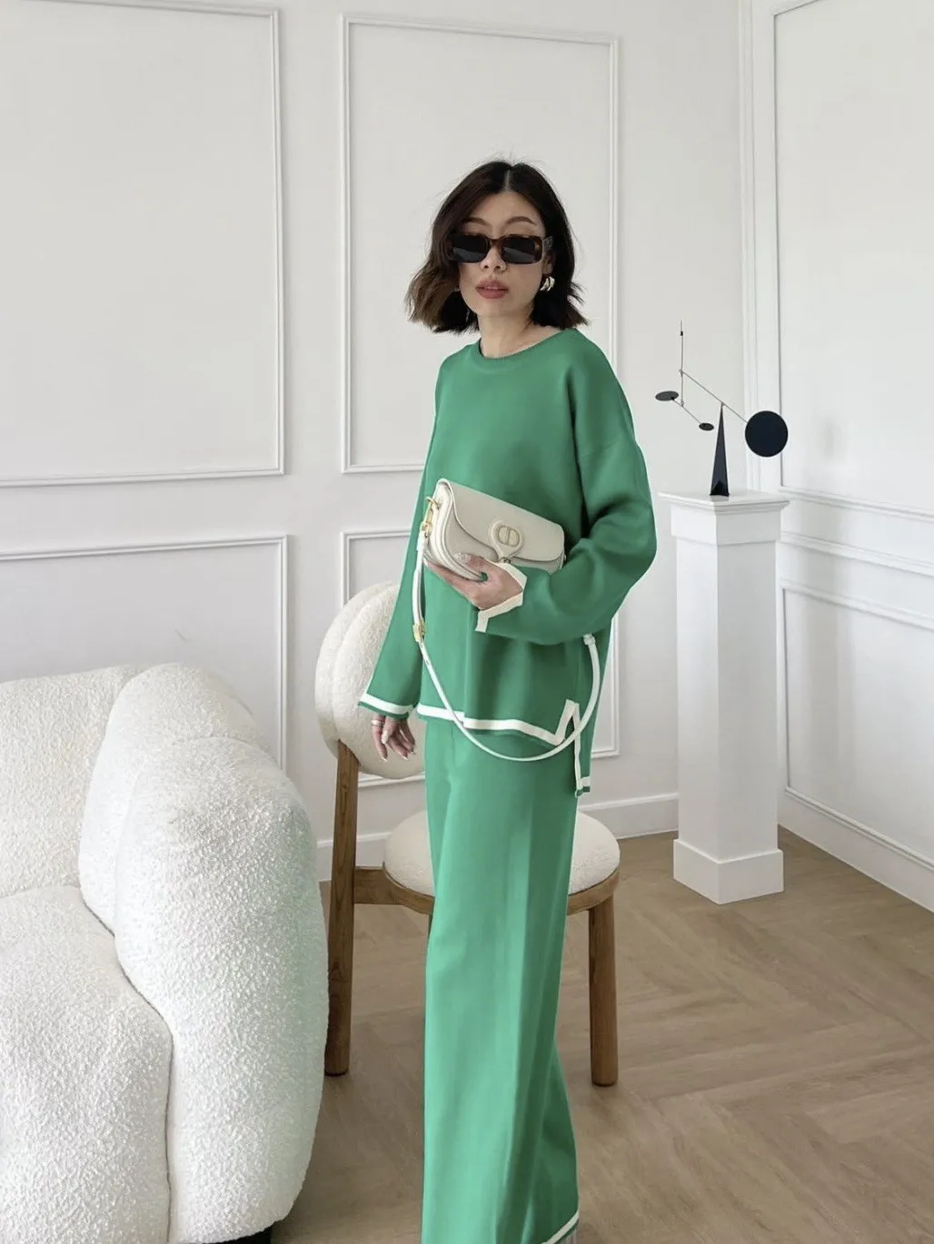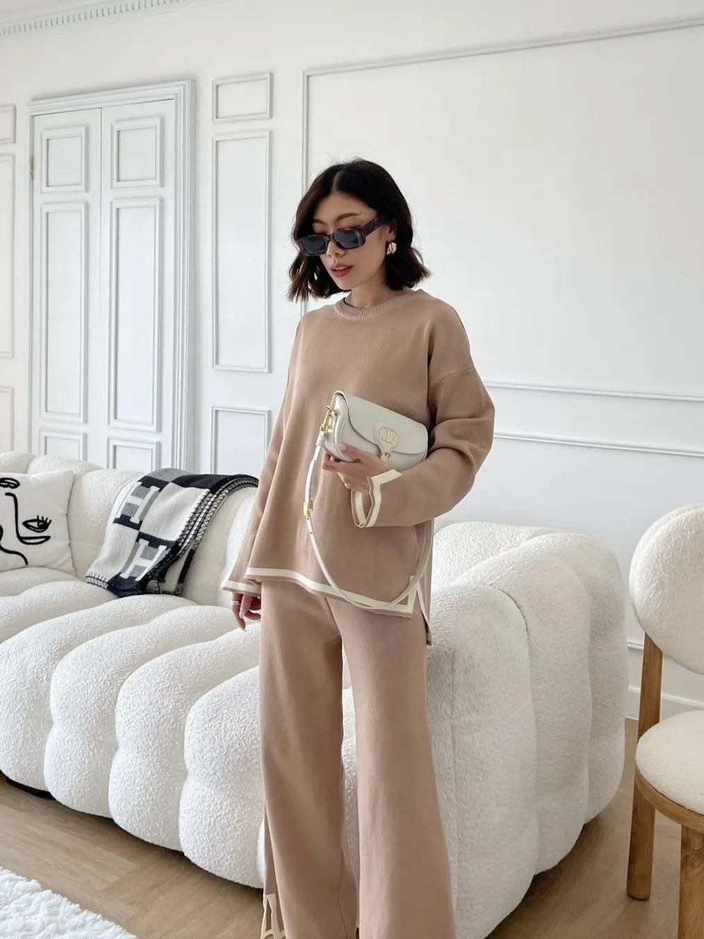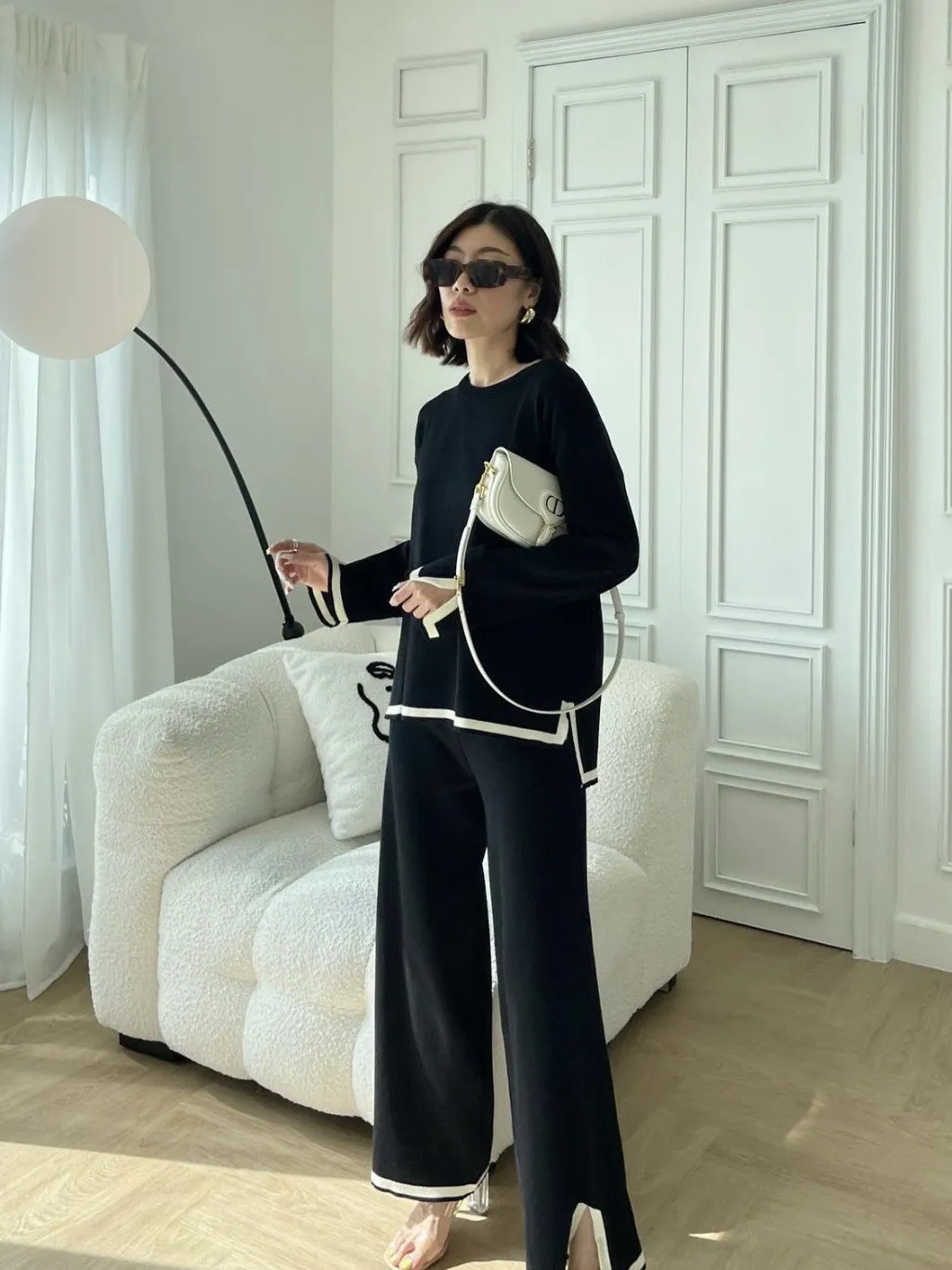 衣都精品- 2023新款半高領長袖撞色拼接圓領上衣+長褲兩件式套裝