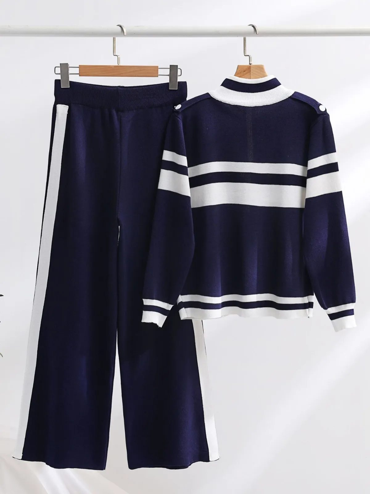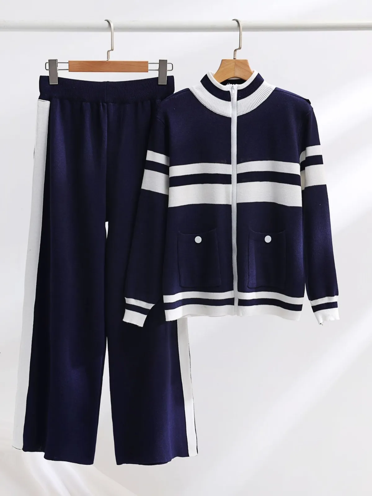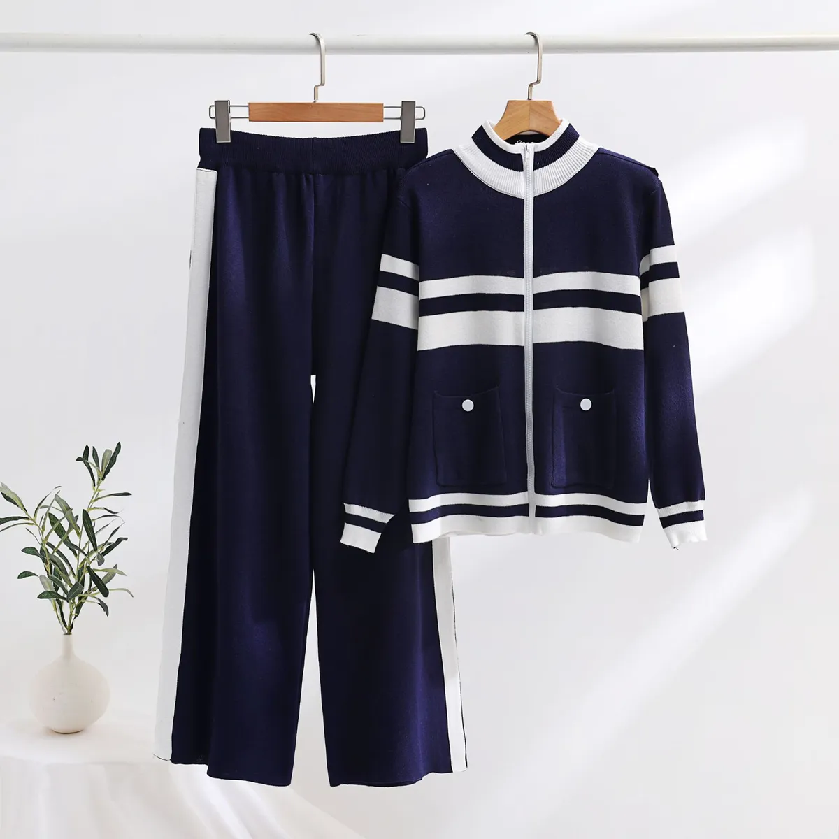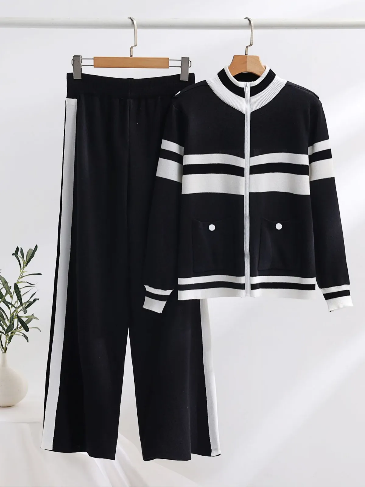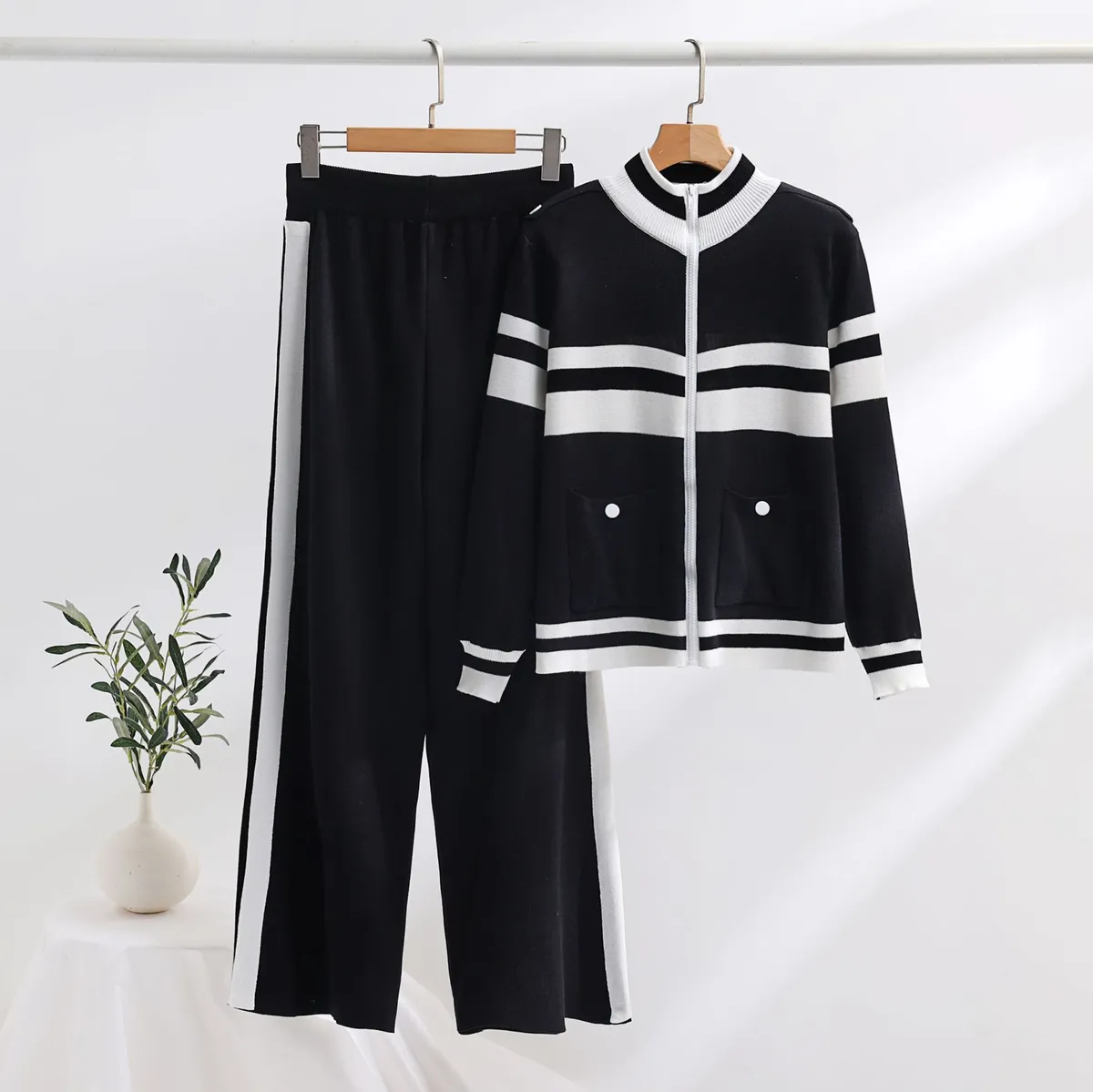 衣都精品- 2023新款彈力撞色休閒寬鬆上衣+闊腿褲兩件式套裝