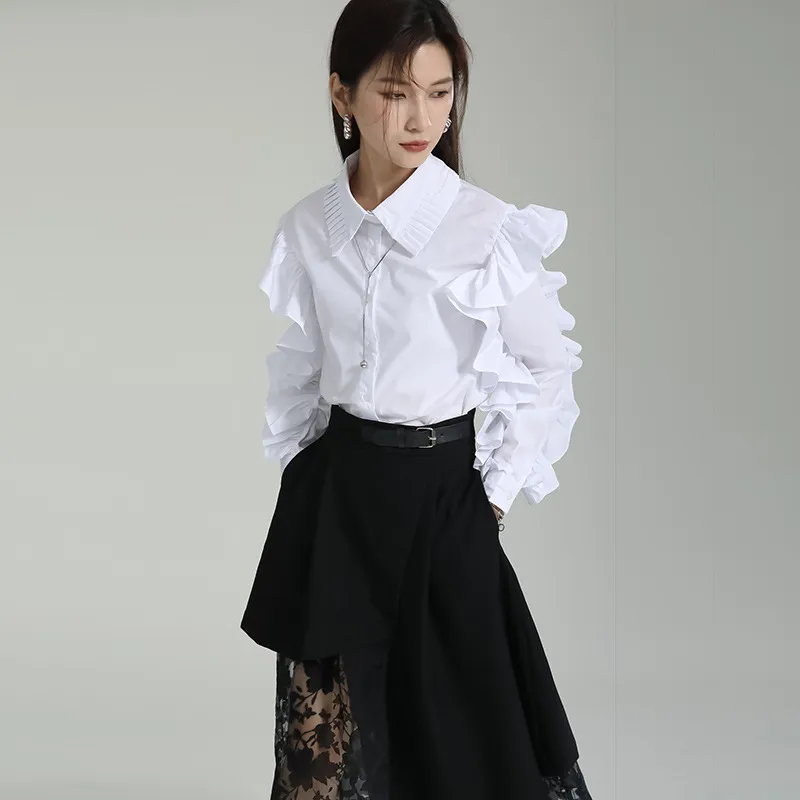 衣都精品- 2023新款不規則大擺拼接網紗長袖上衣