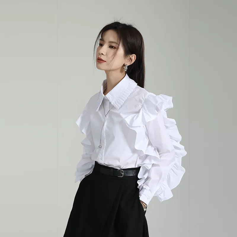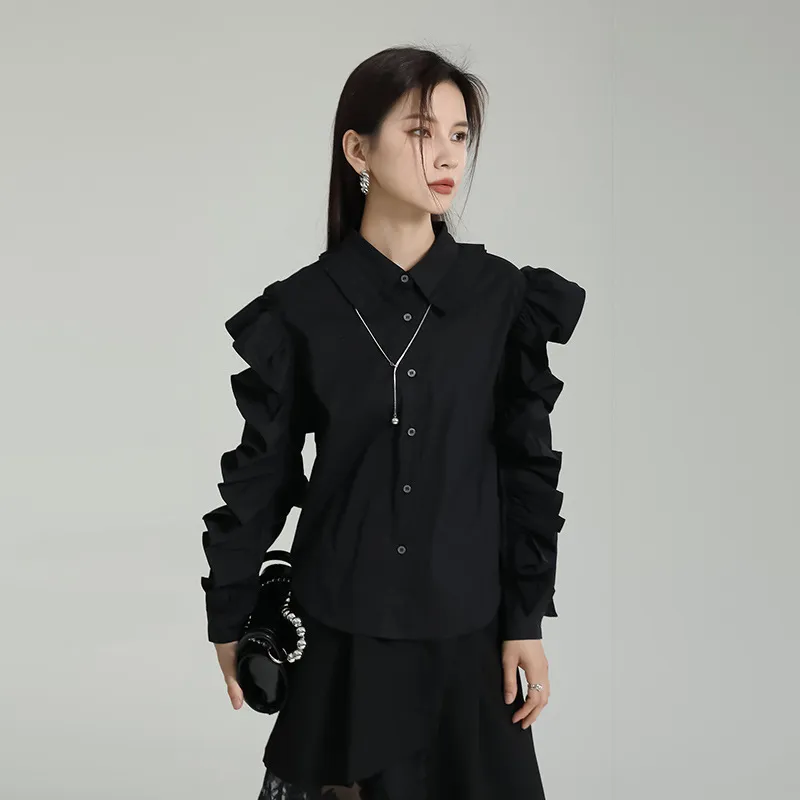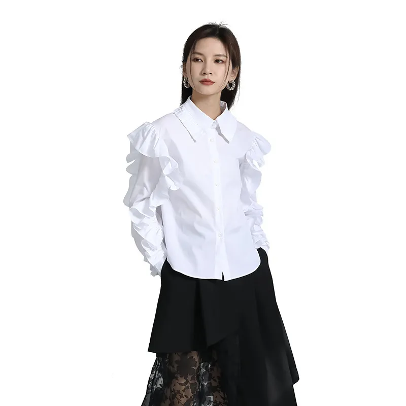 衣都精品- 2023新款設計師款壓褶翻領荷葉袖上衣