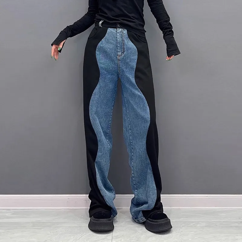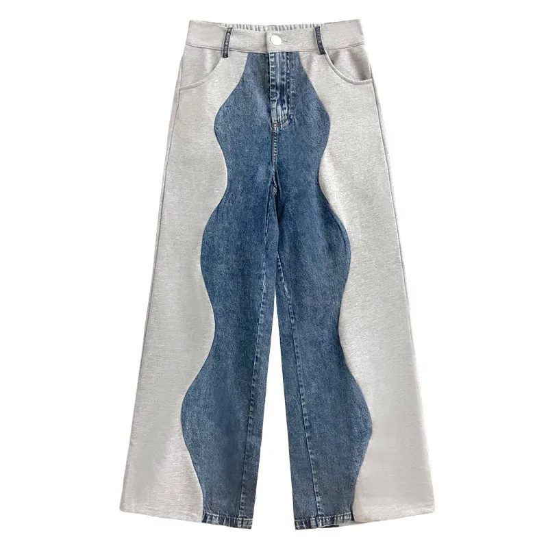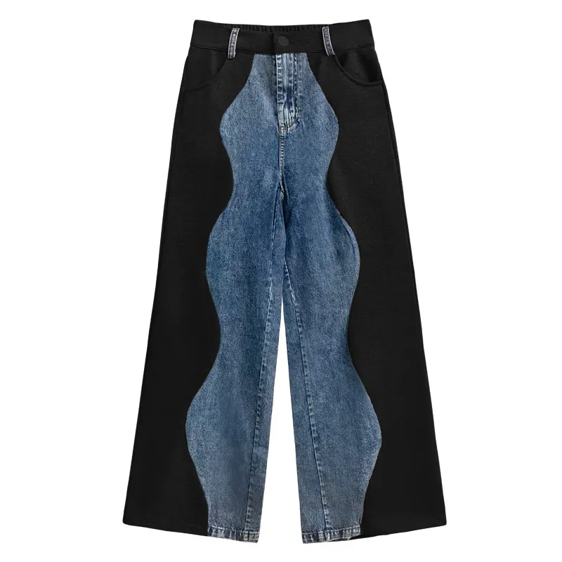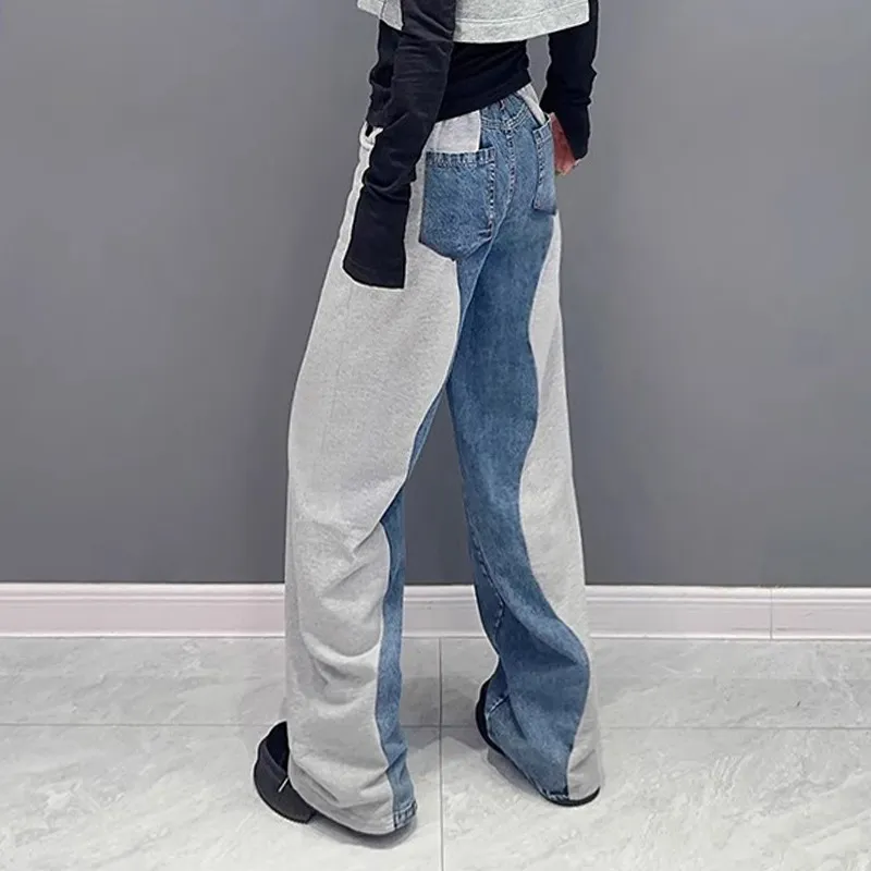 衣都精品- 2023新款歐風潮牌撞色拼接牛仔闊腿褲