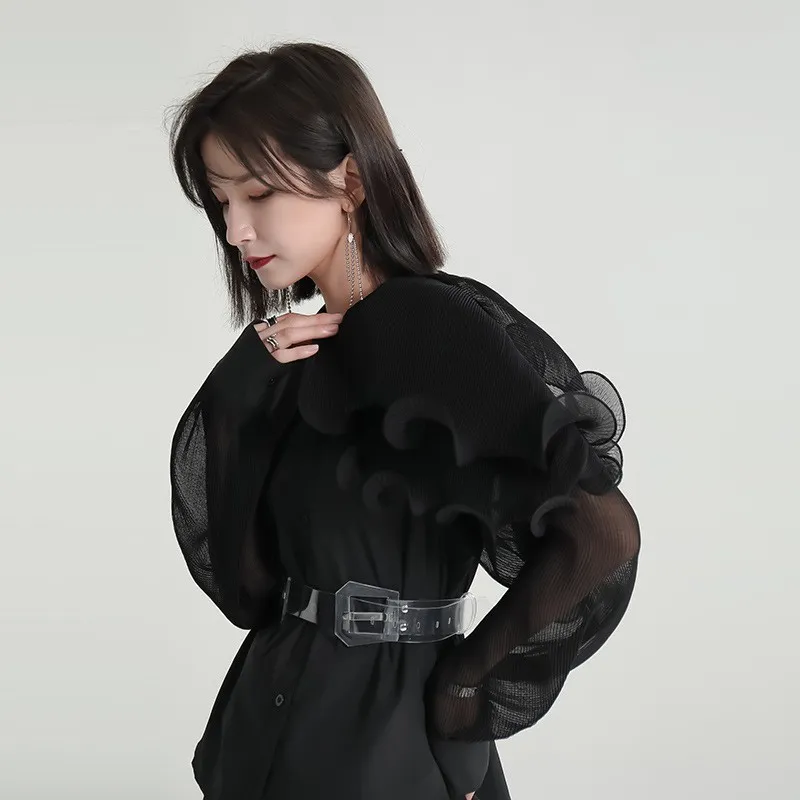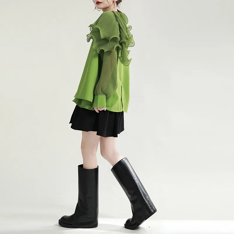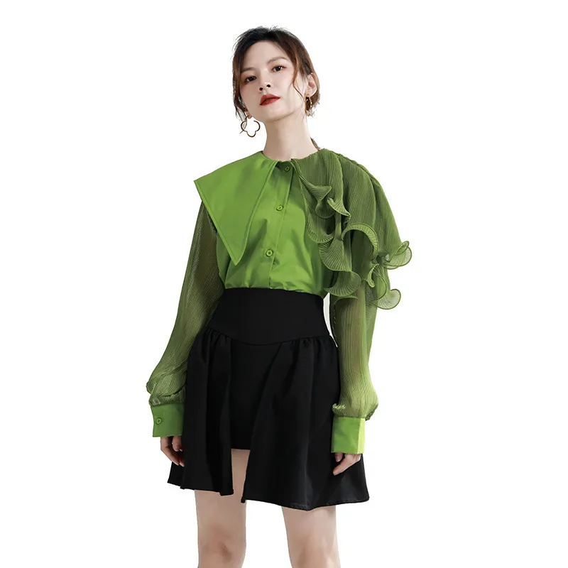 衣都精品- 2023新款翻領皺褶荷葉邊不規則拼接上衣